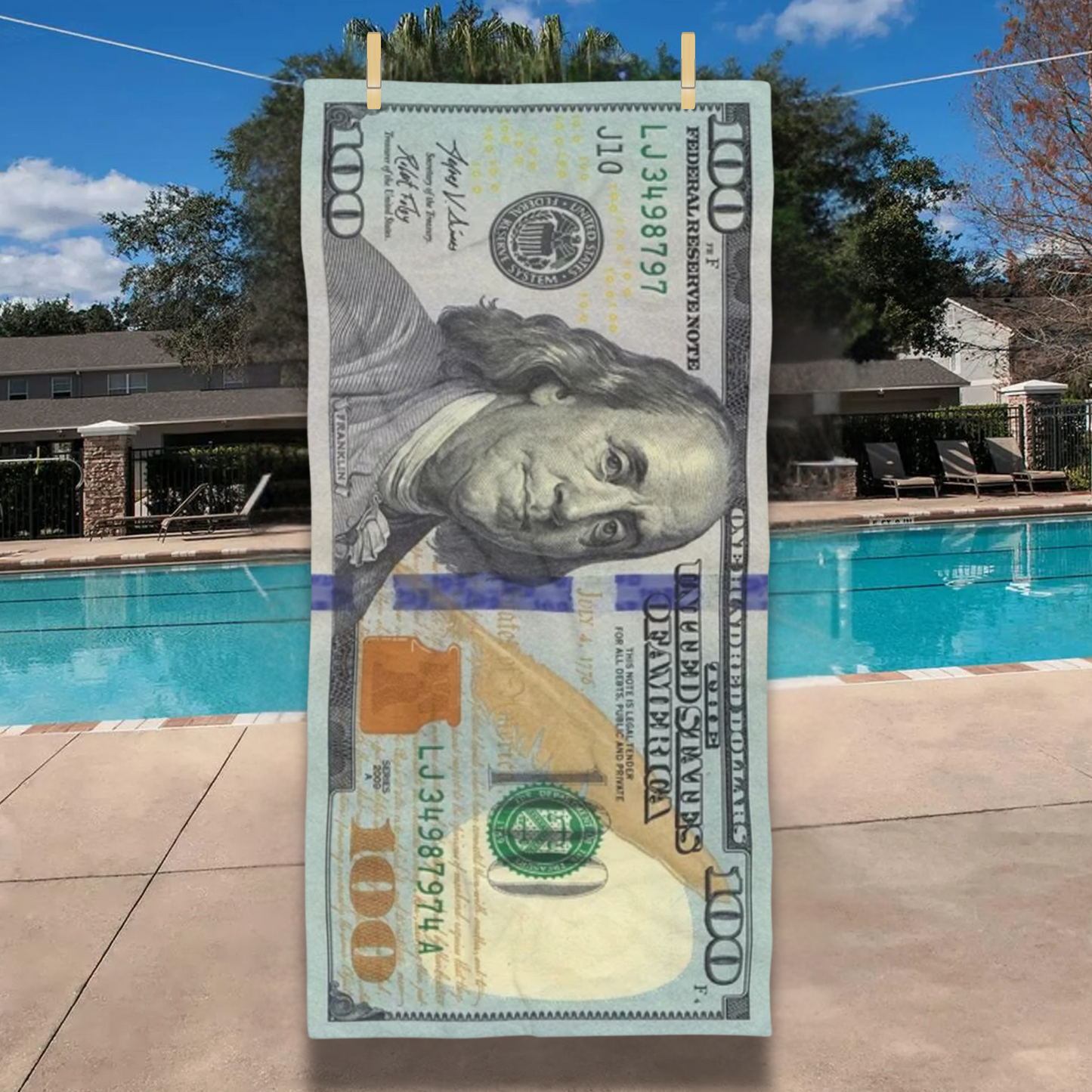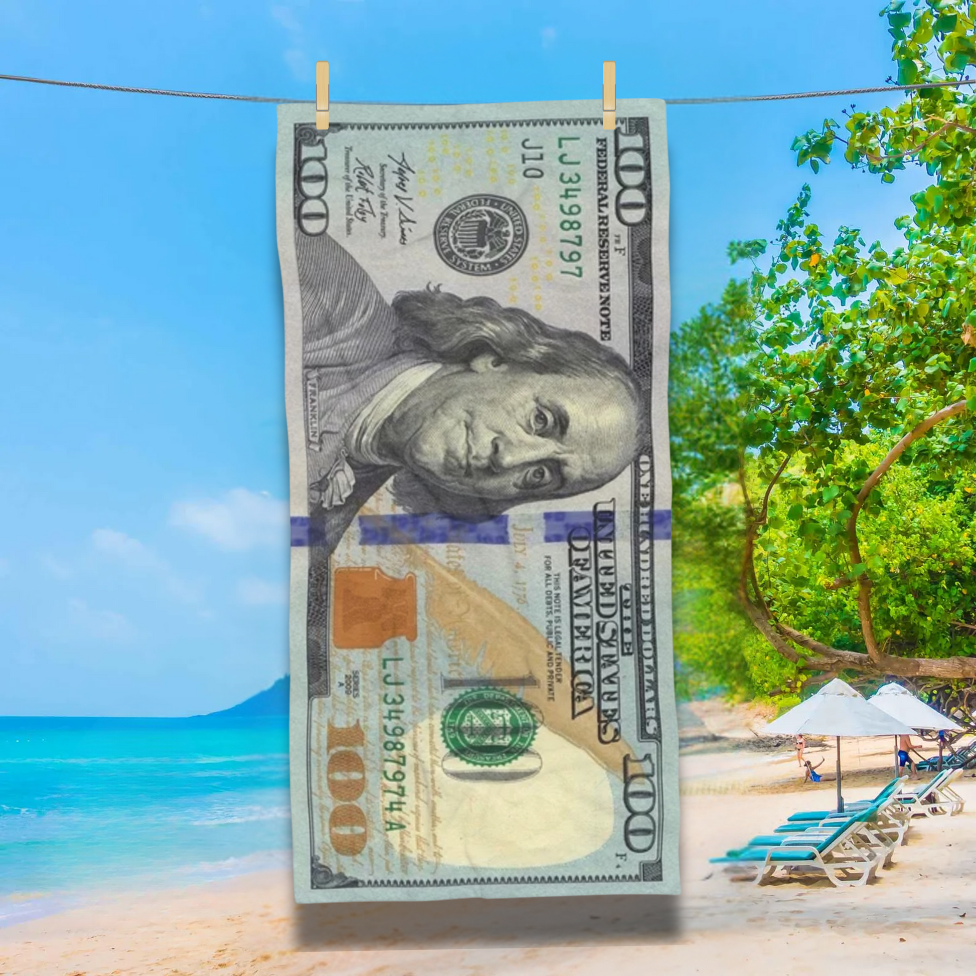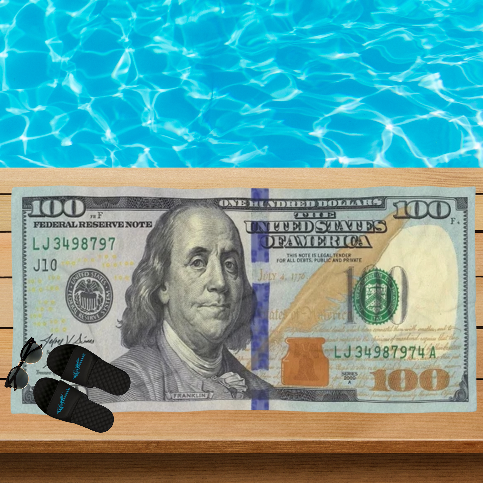 This 100 Bill luxury beach towel is a fun, novelty accessory featuring a design that mimics the appearance of a $100 US dollar bill, adding a playful and eye-catching element to your beach or poolside gear while making a bold fashion statement with its realistic currency-inspired print.