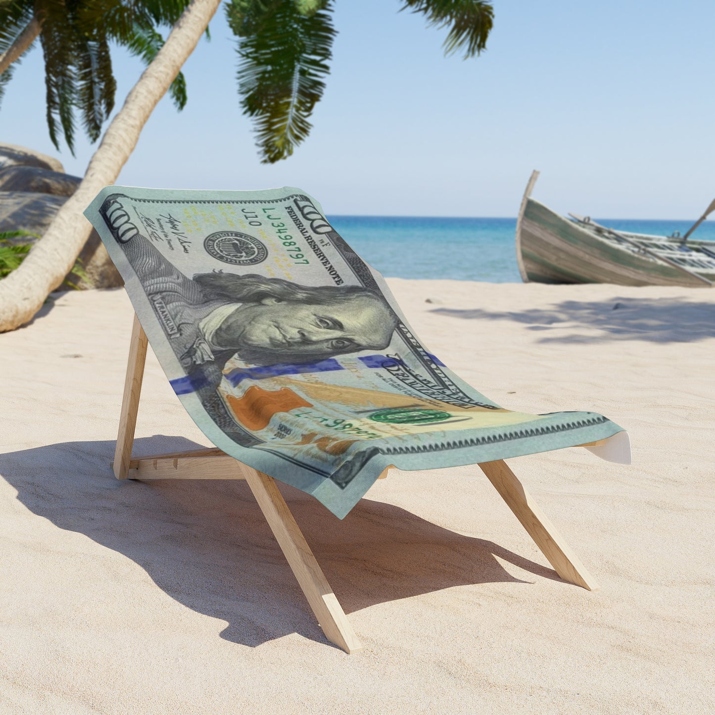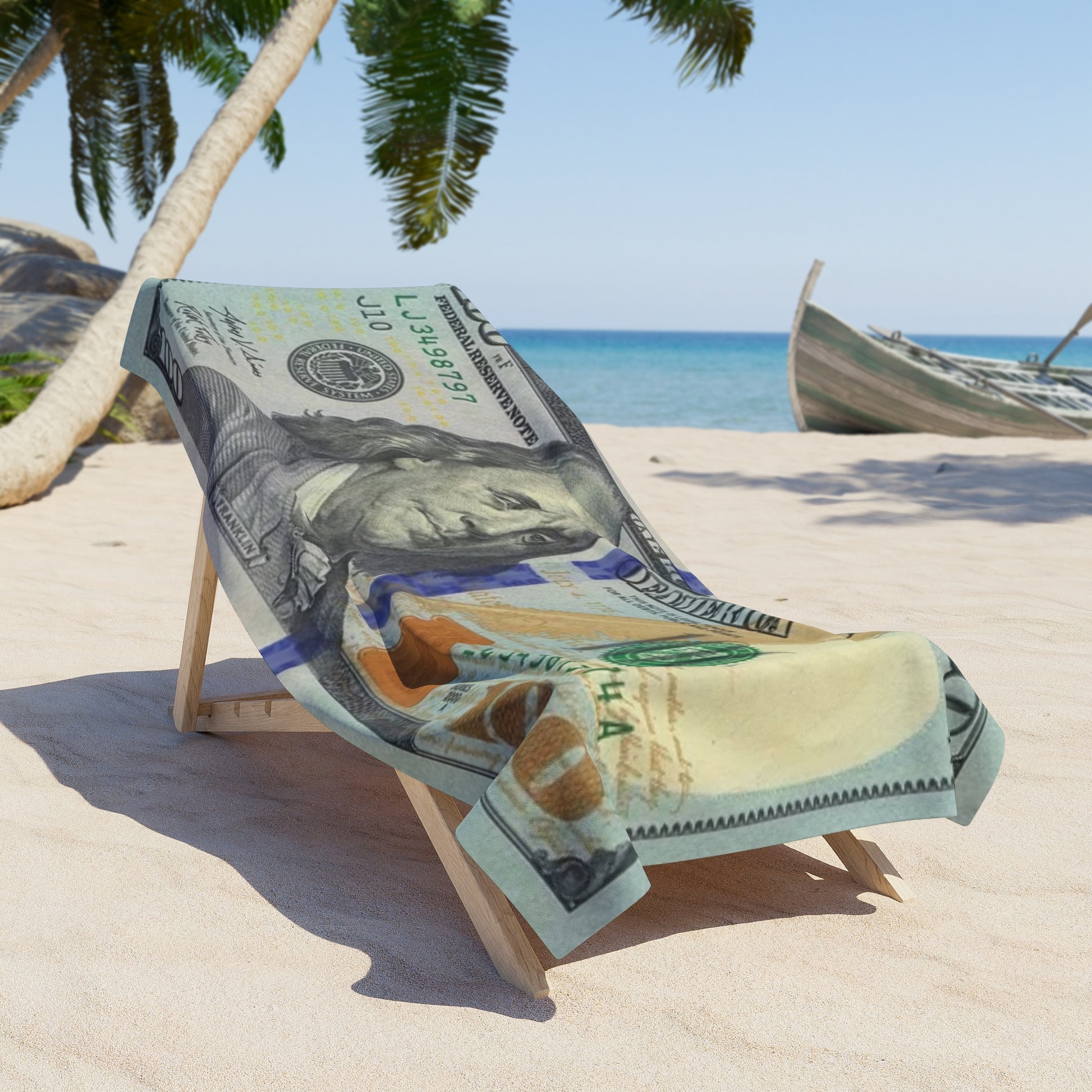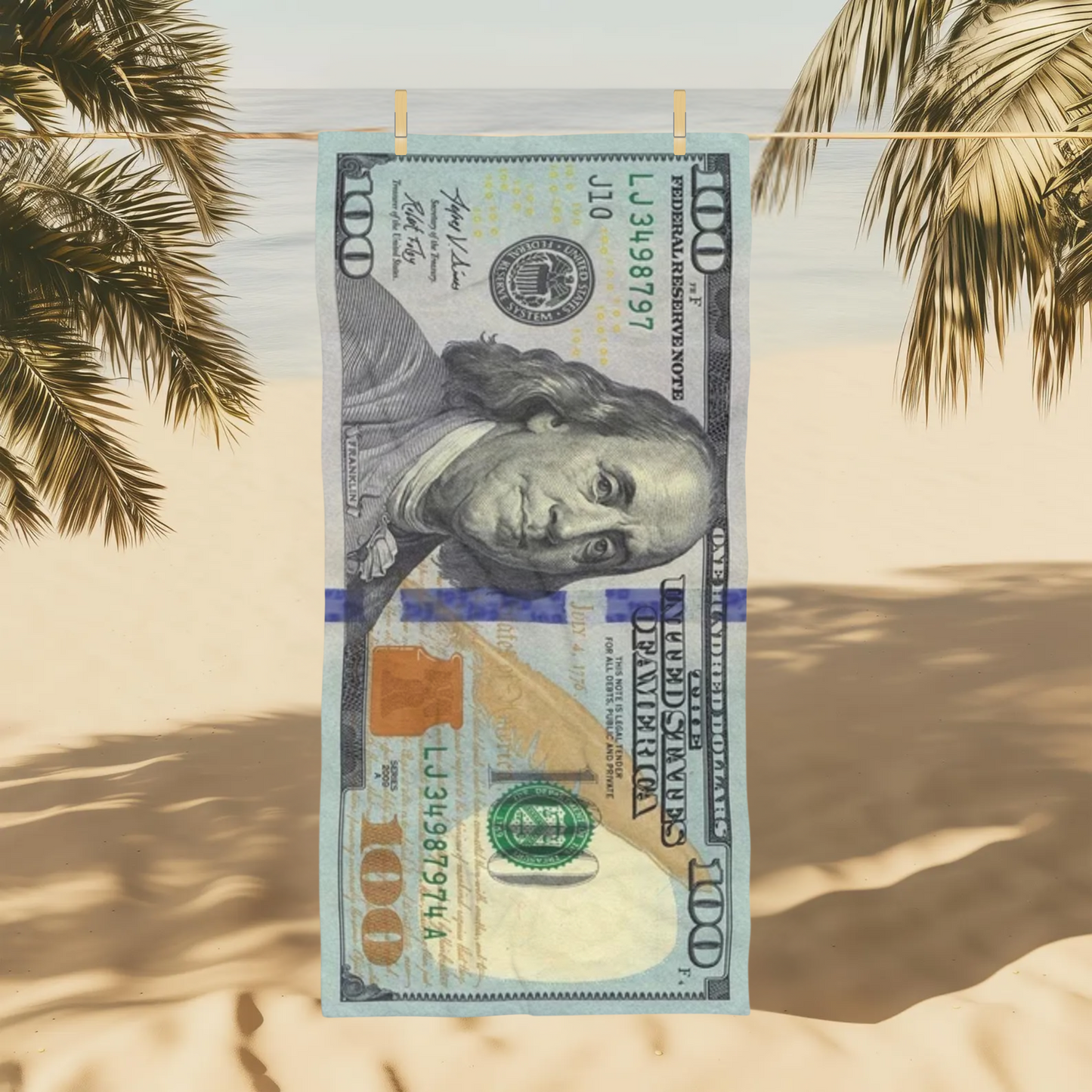 This 100 Bill luxury beach towel is a fun, novelty accessory featuring a design that mimics the appearance of a $100 US dollar bill, adding a playful and eye-catching element to your beach or poolside gear while making a bold fashion statement with its realistic currency-inspired print.