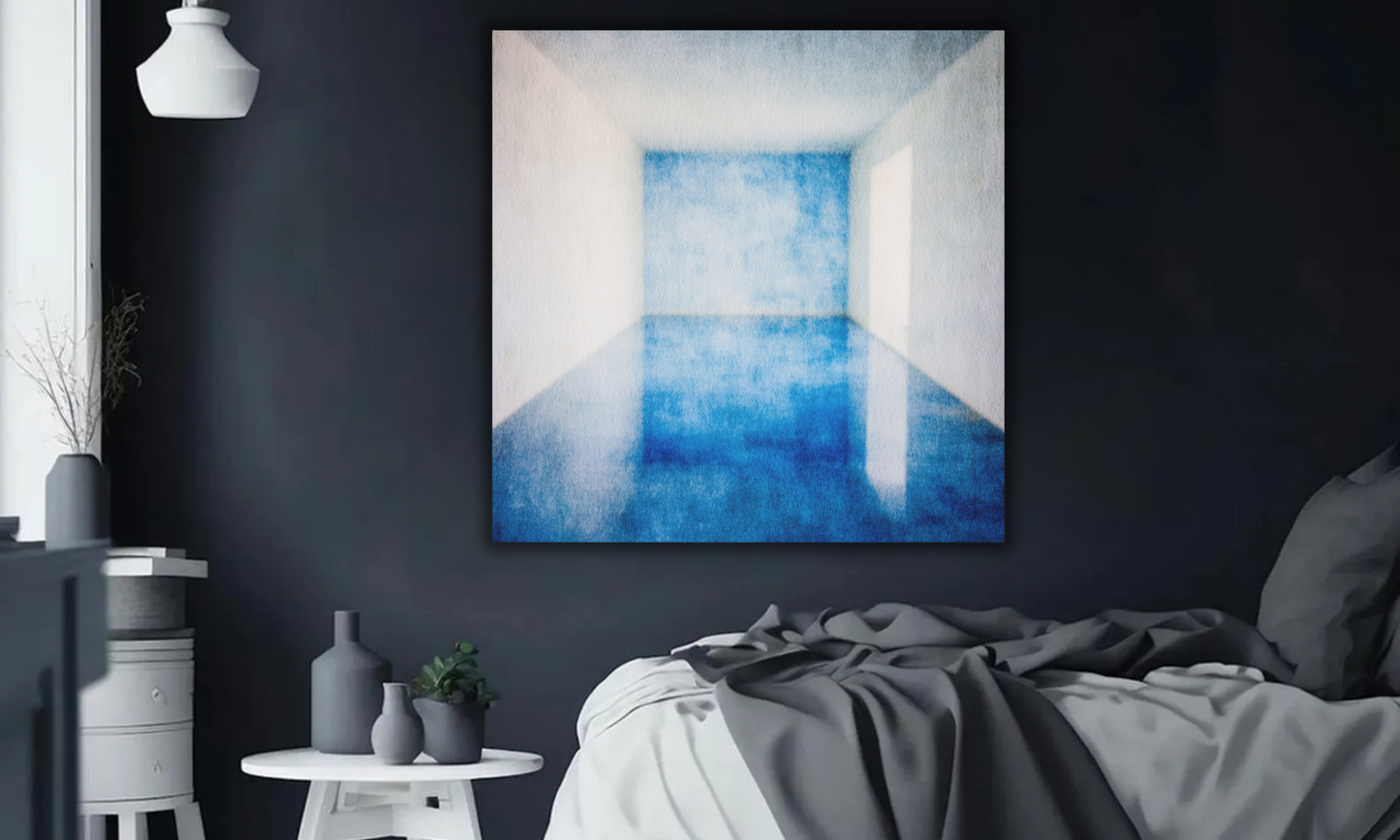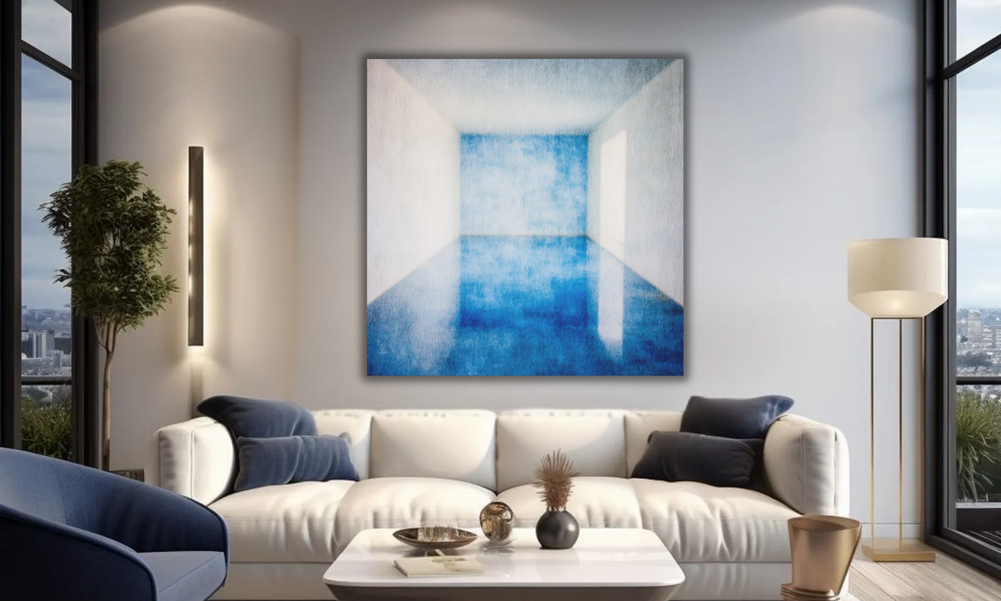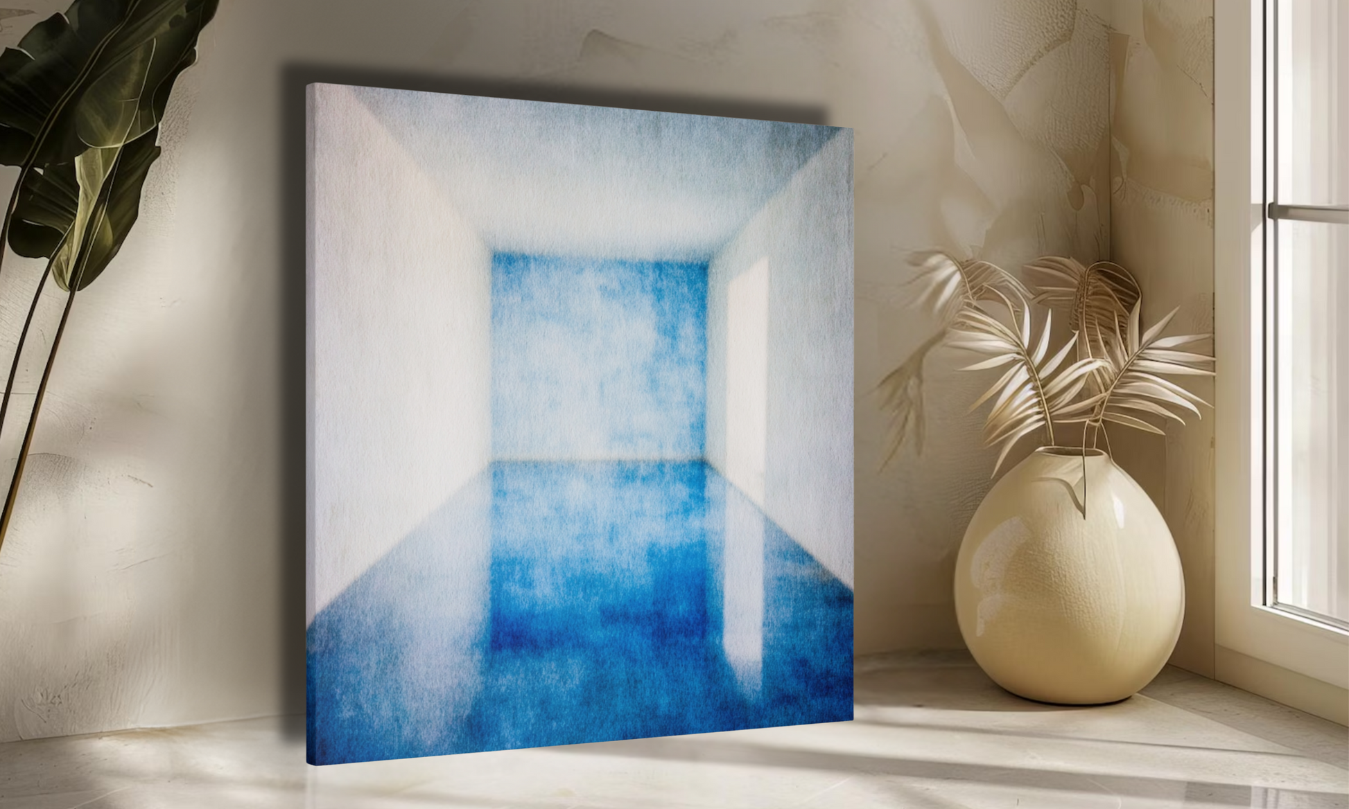 This "Abstract Empty Blue Gallery Room" canvas wall art features a calming and sophisticated abstract depiction of a spacious gallery interior in shades of blue and white, evoking feelings of tranquility and introspection. The abstract design captures the essence of an open, minimalist space, making it an ideal focal point for modern and contemporary interiors. Its serene color palette and artistic composition enhance the ambiance of any room, adding a touch of elegance and depth while allowing viewers to interpret the space creatively, perfect for living rooms, offices, or art-inspired environments.