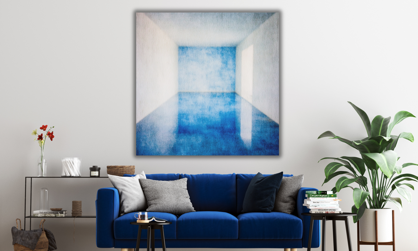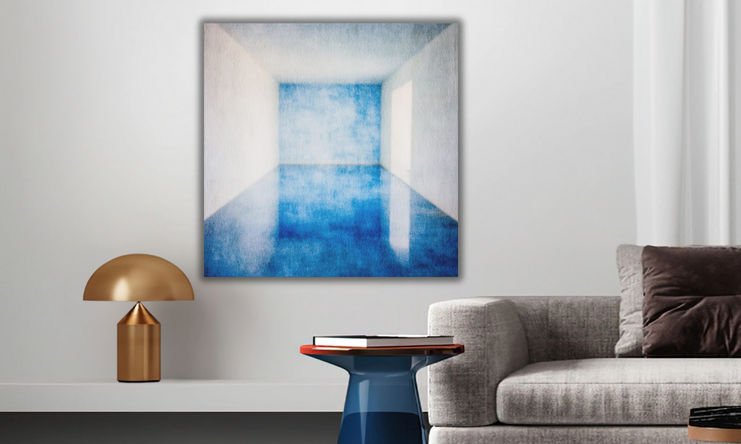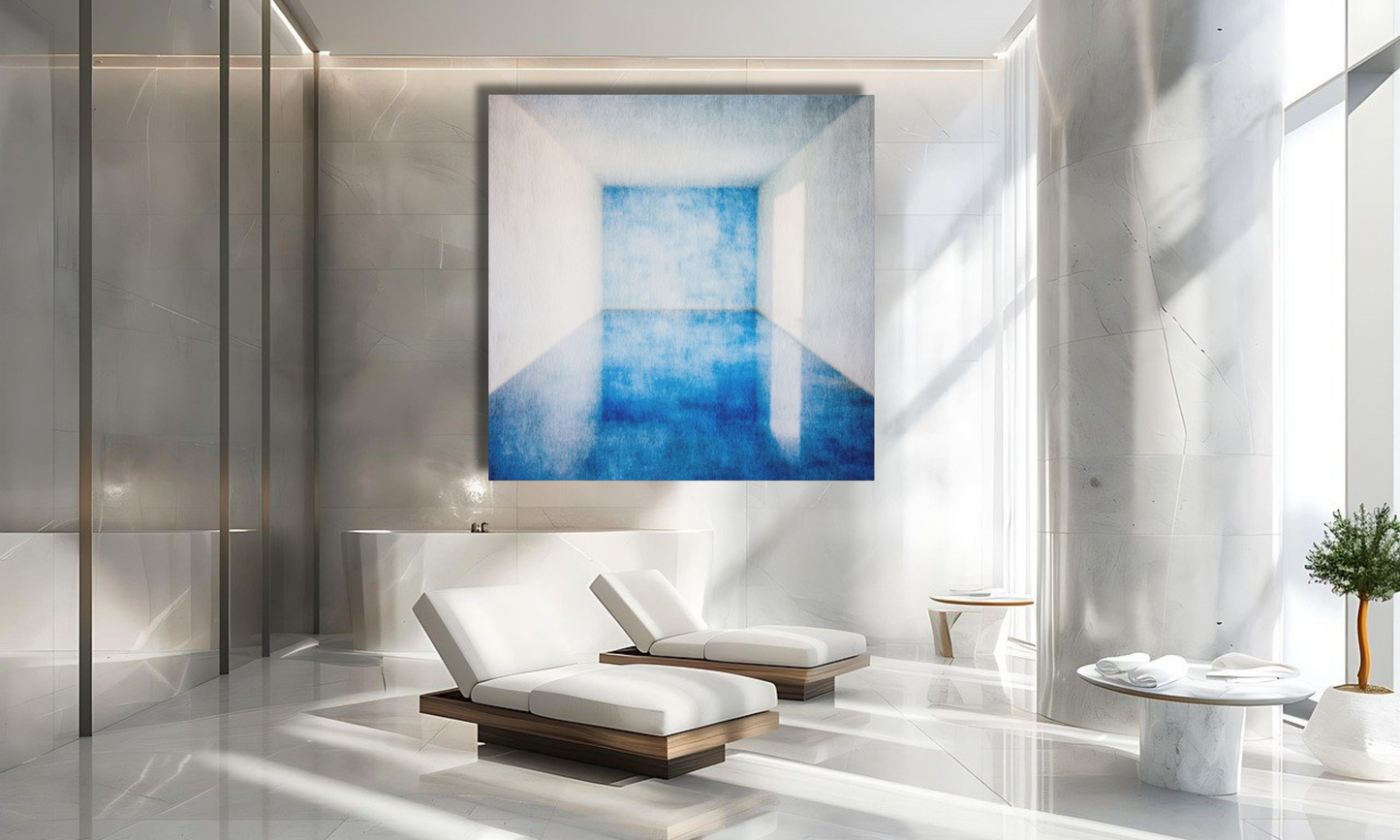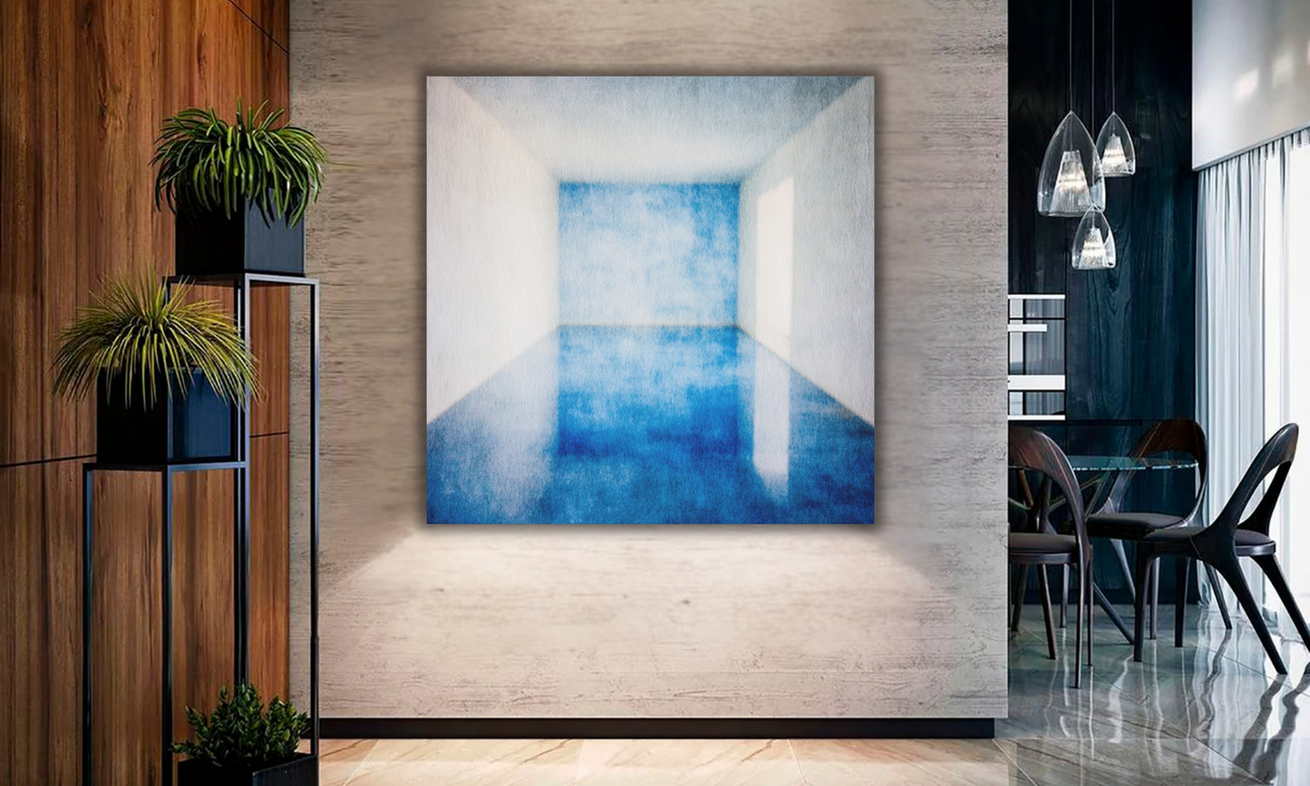 This "Abstract Empty Blue Gallery Room" canvas wall art features a calming and sophisticated abstract depiction of a spacious gallery interior in shades of blue and white, evoking feelings of tranquility and introspection. The abstract design captures the essence of an open, minimalist space, making it an ideal focal point for modern and contemporary interiors. Its serene color palette and artistic composition enhance the ambiance of any room, adding a touch of elegance and depth while allowing viewers to interpret the space creatively, perfect for living rooms, offices, or art-inspired environments.