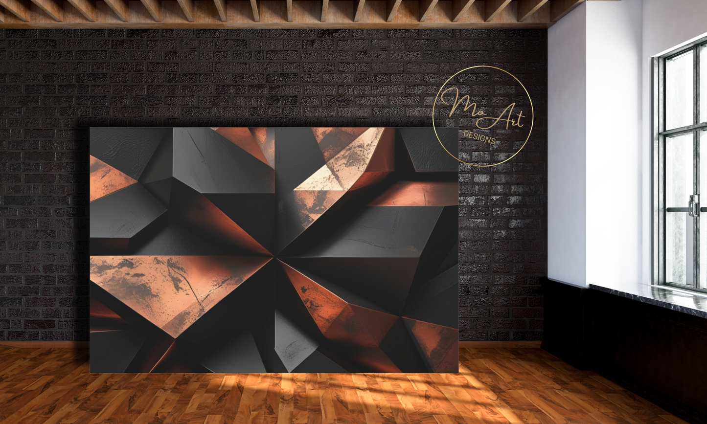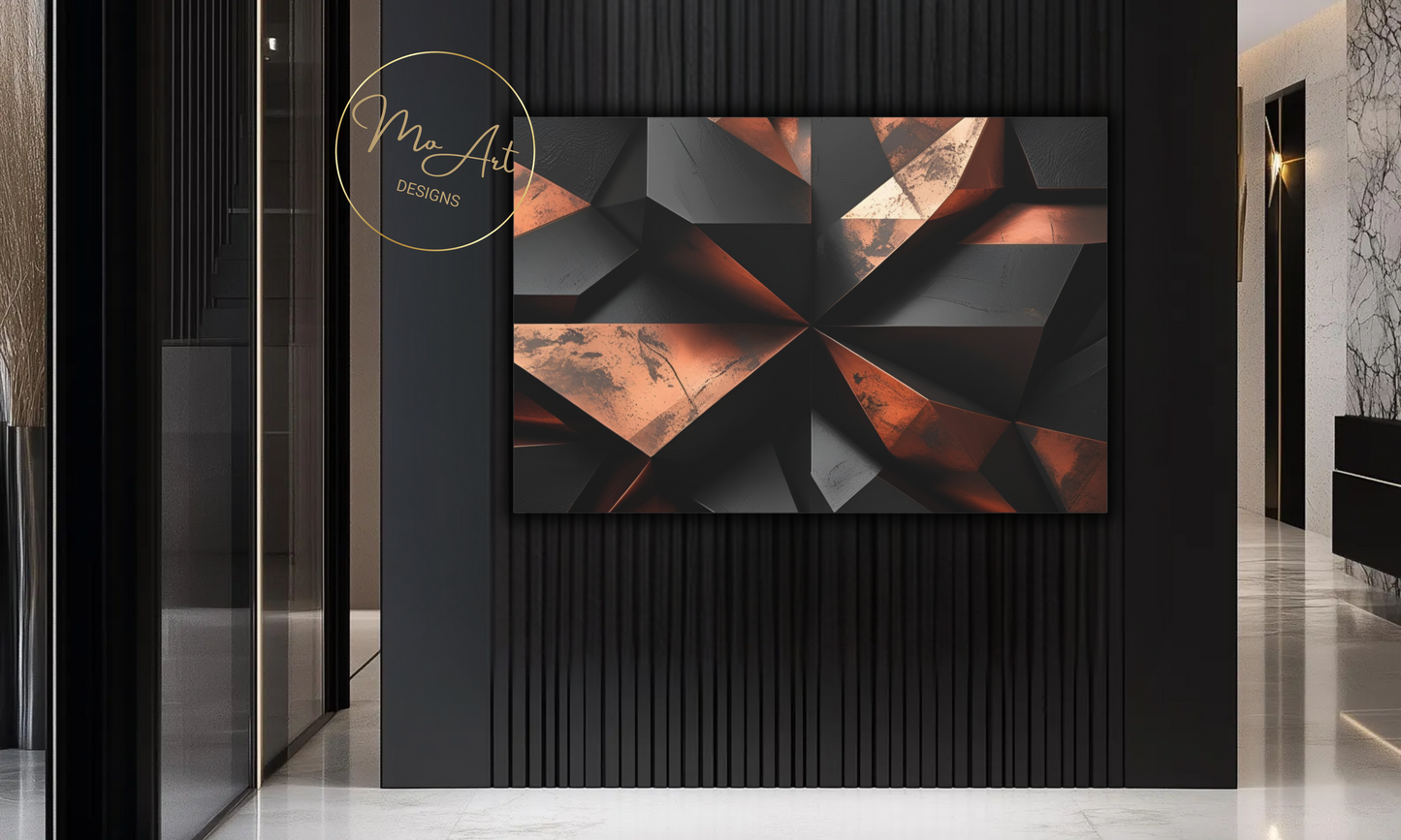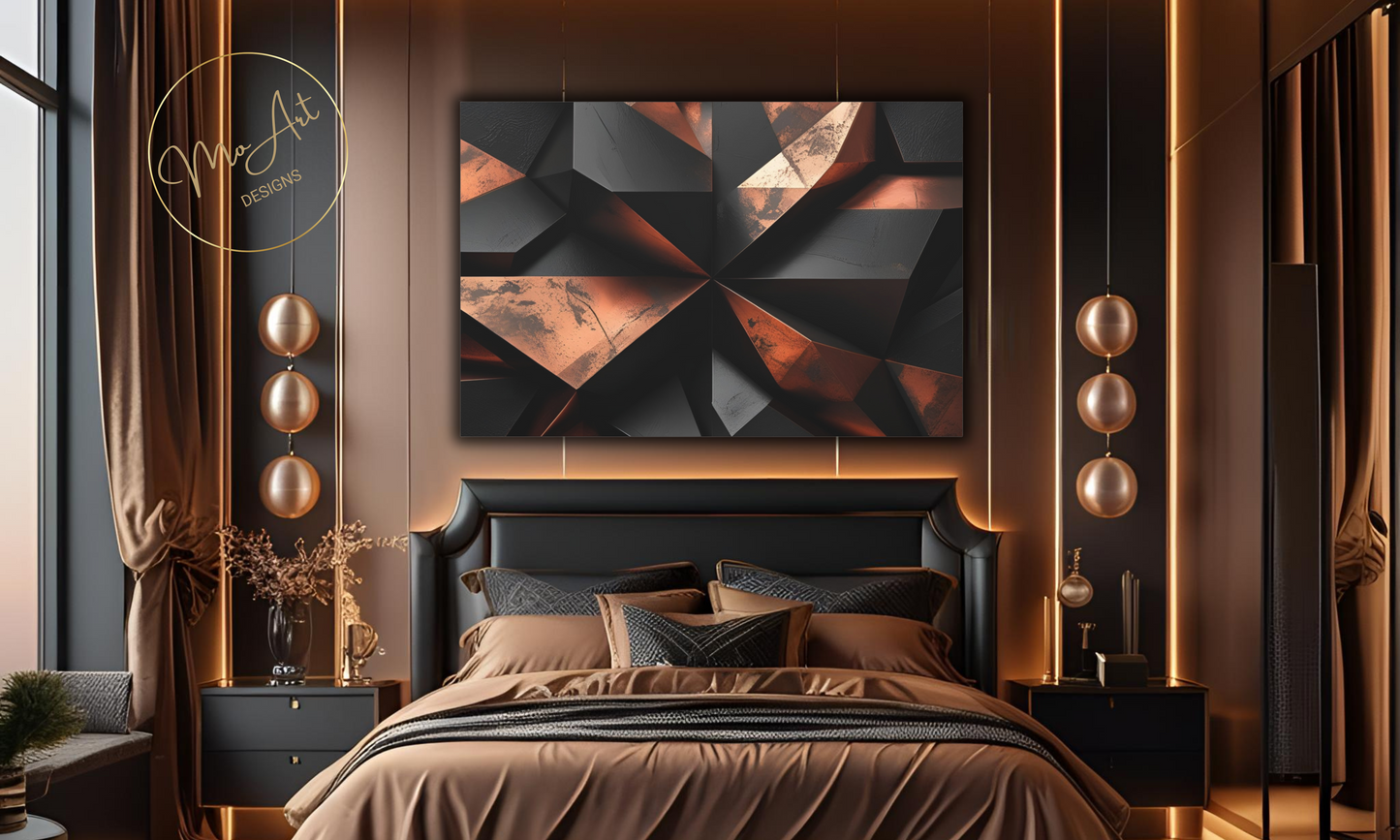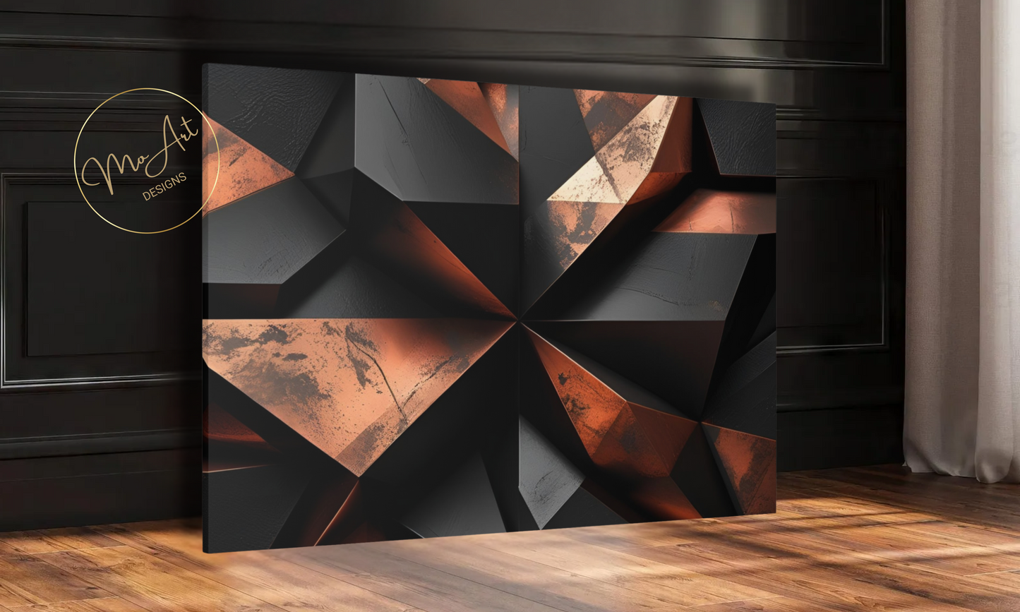 This Abstract Geometric Black and Copper canvas wall art features bold, modern designs that blend sleek black shapes with warm copper accents, creating a striking visual contrast perfect for contemporary interiors. The artwork's geometric patterns add a sense of structure and sophistication, making it an ideal statement piece for living rooms, bedrooms, or office spaces. Crafted with high-quality materials, it offers durability and a polished finish that enhances its aesthetic appeal, transforming any wall into a focal point of stylish elegance.