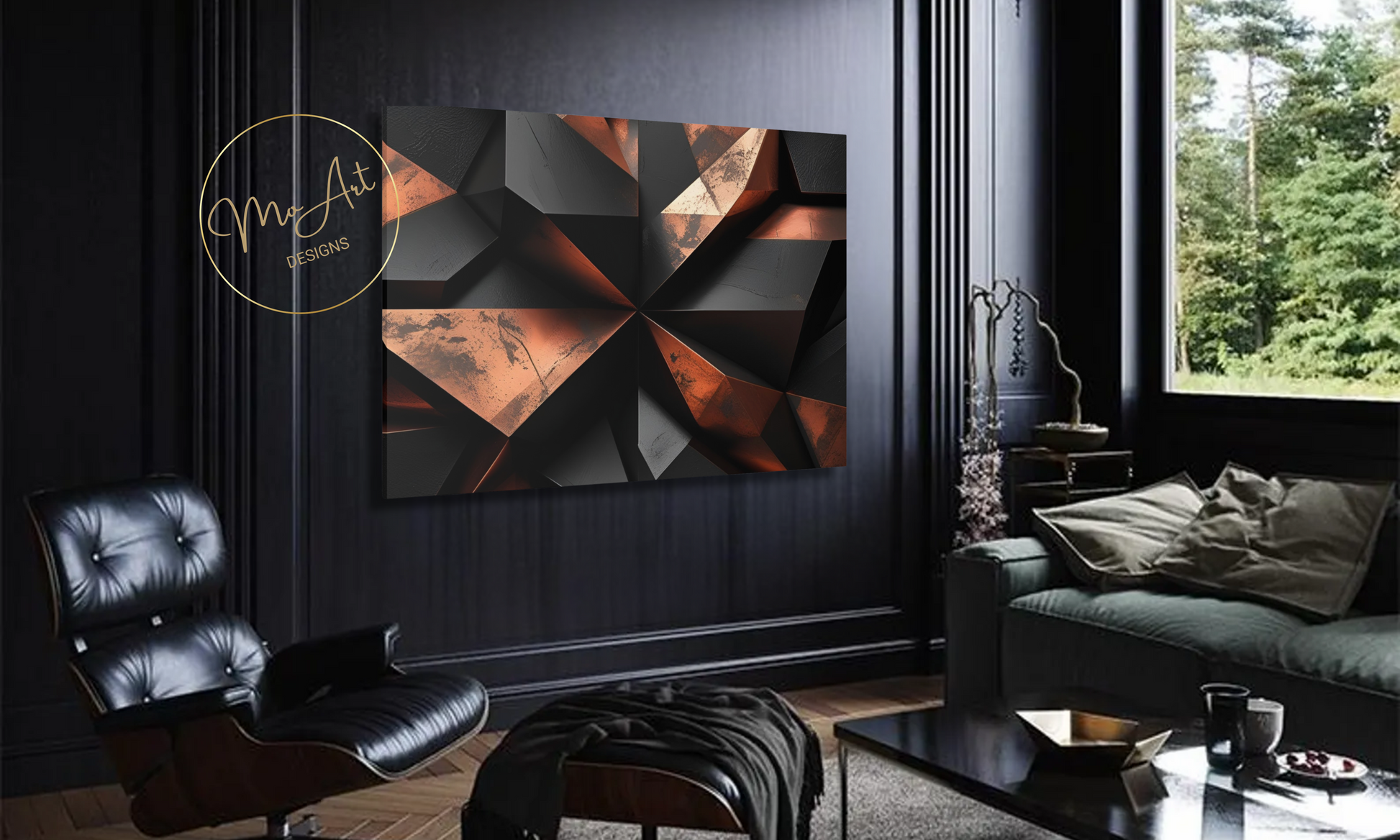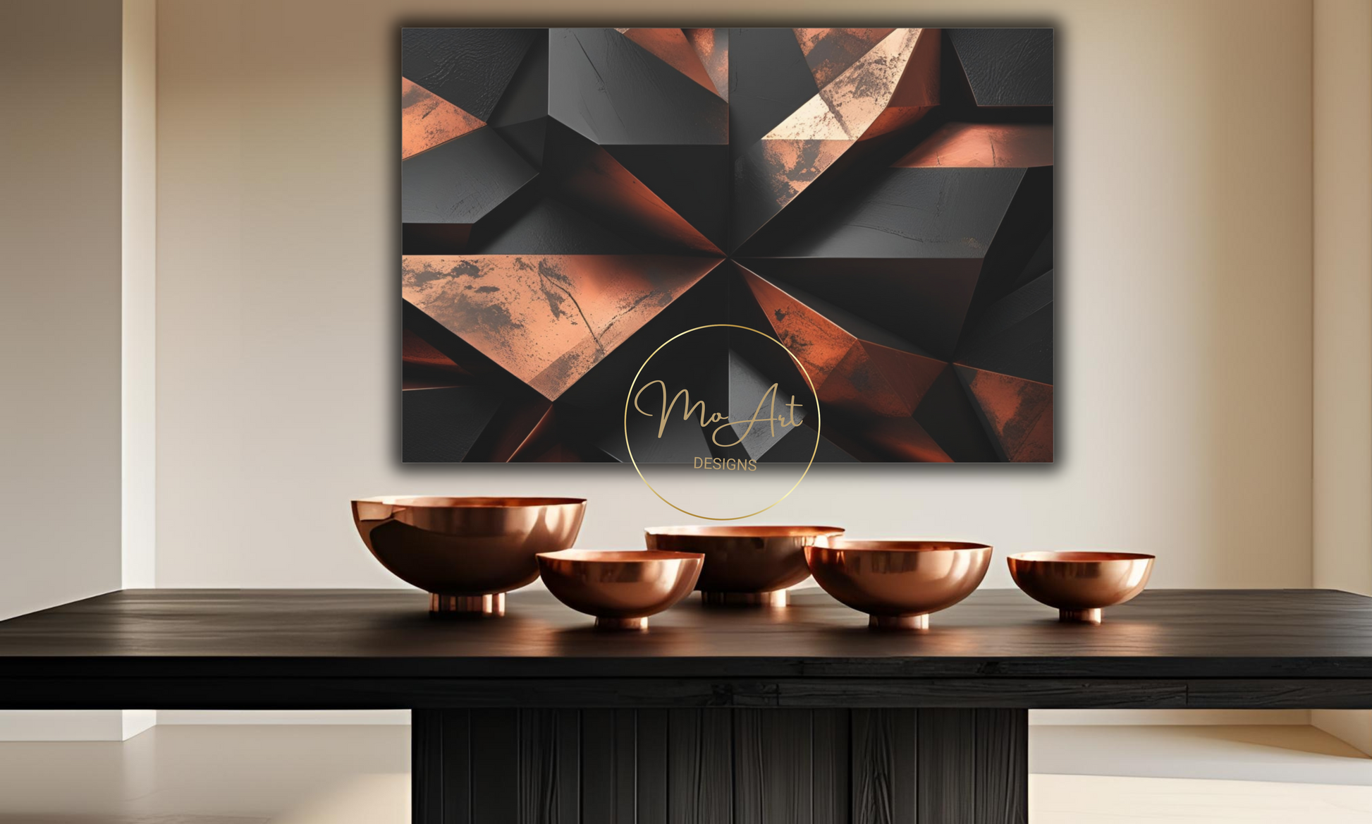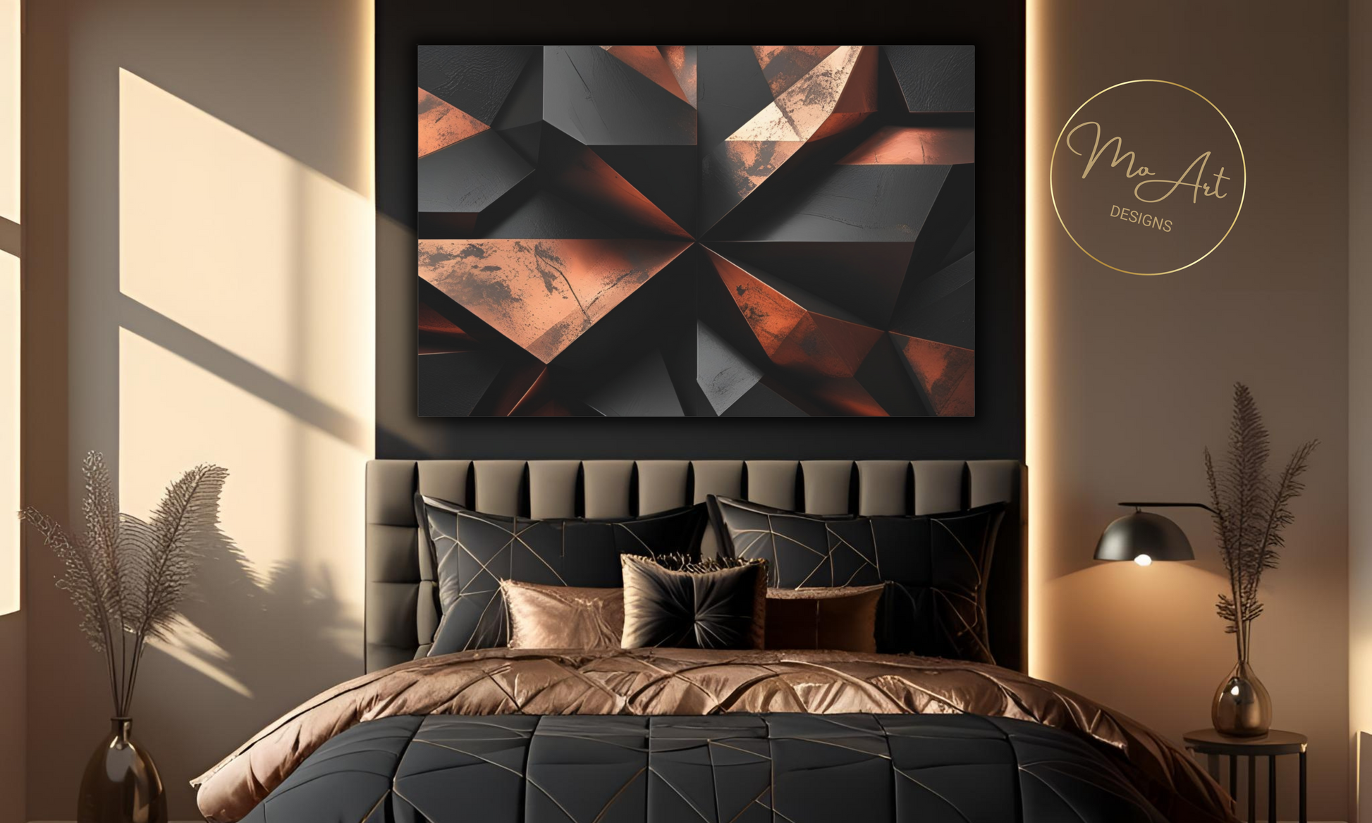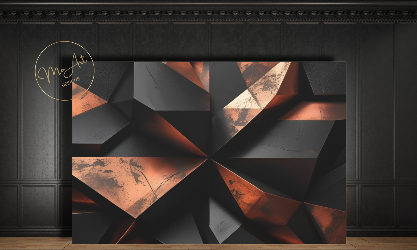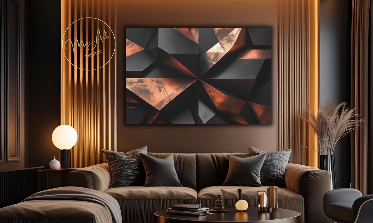 This Abstract Geometric Black and Copper canvas wall art features bold, modern designs that blend sleek black shapes with warm copper accents, creating a striking visual contrast perfect for contemporary interiors. The artwork's geometric patterns add a sense of structure and sophistication, making it an ideal statement piece for living rooms, bedrooms, or office spaces. Crafted with high-quality materials, it offers durability and a polished finish that enhances its aesthetic appeal, transforming any wall into a focal point of stylish elegance.