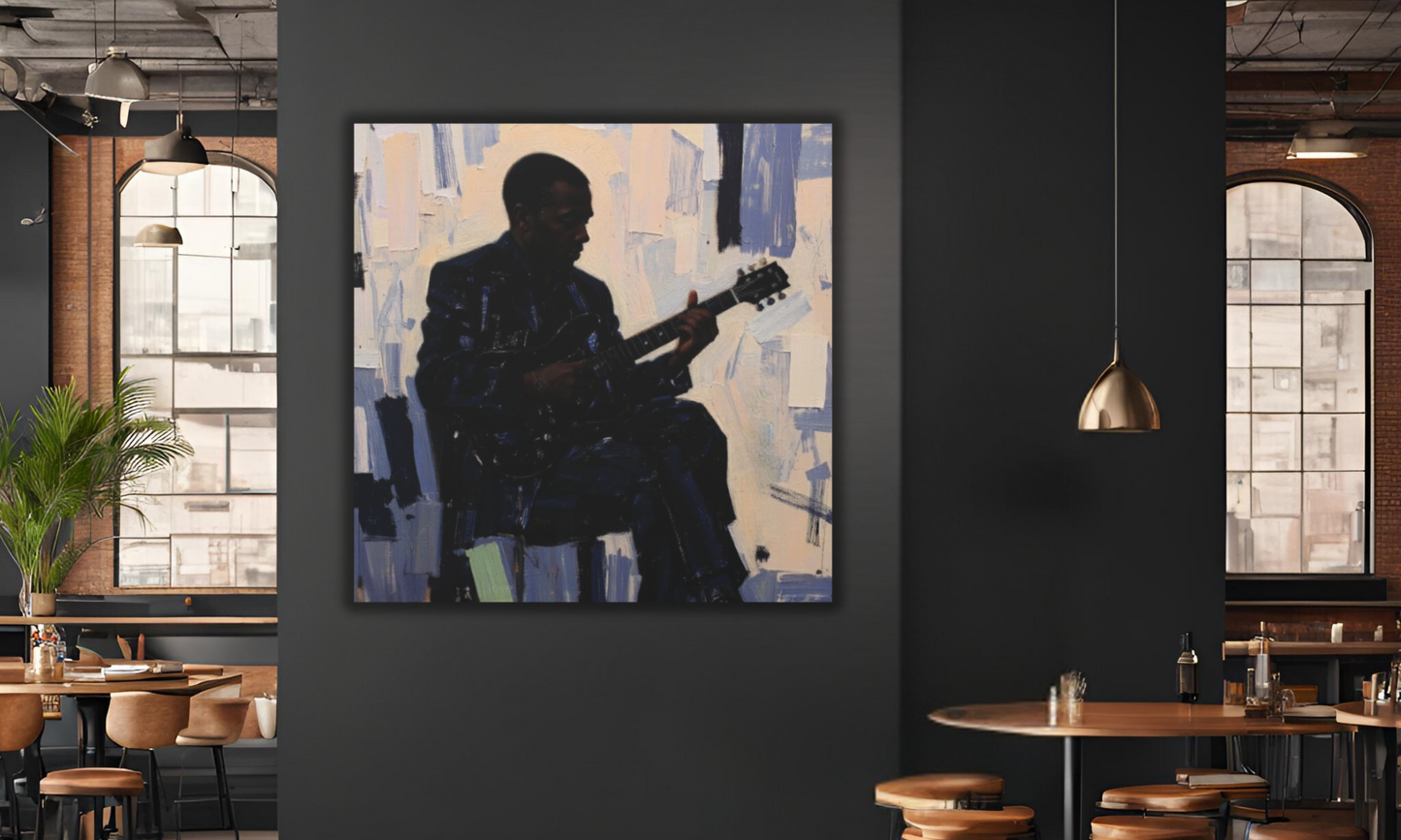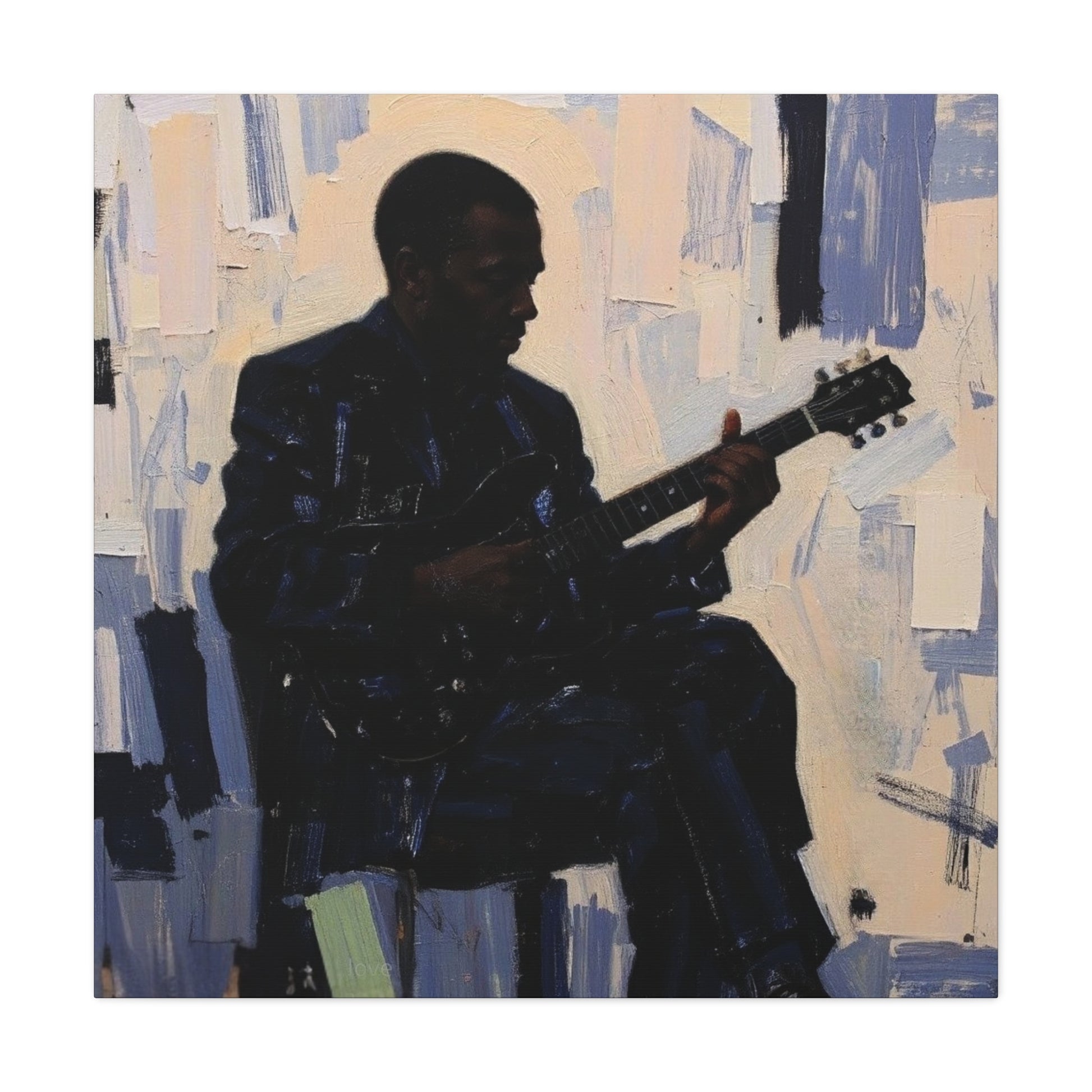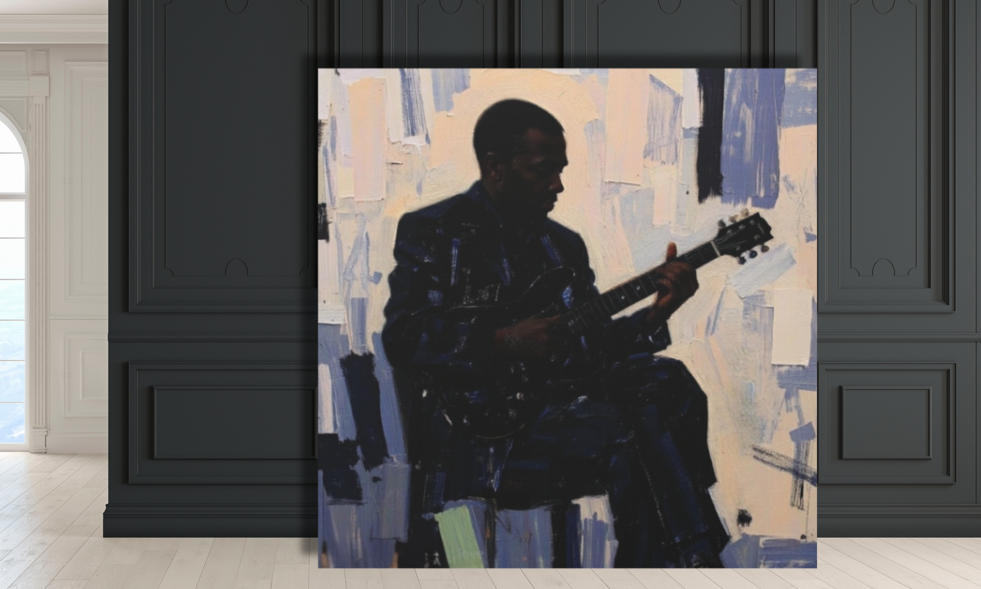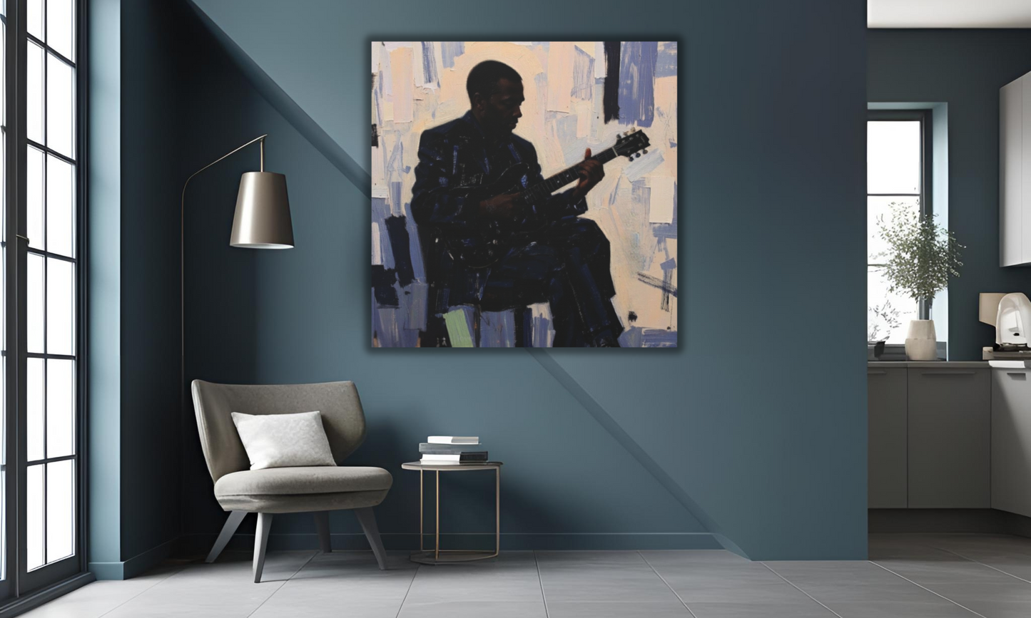 "Abstract Blues Jazz Guitarist" canvas art captures the soulful essence of blues/jazz music through expressive brushstrokes, emphasizing the dynamic energy and improvisational spirit of jazz guitarists. Perfect for music enthusiasts and art lovers alike, it adds a touch of sophistication and musical inspiration to any space. The high-quality print on durable canvas ensures lasting visual impact, making it an ideal decorative piece for homes, music studios, or jazz clubs.