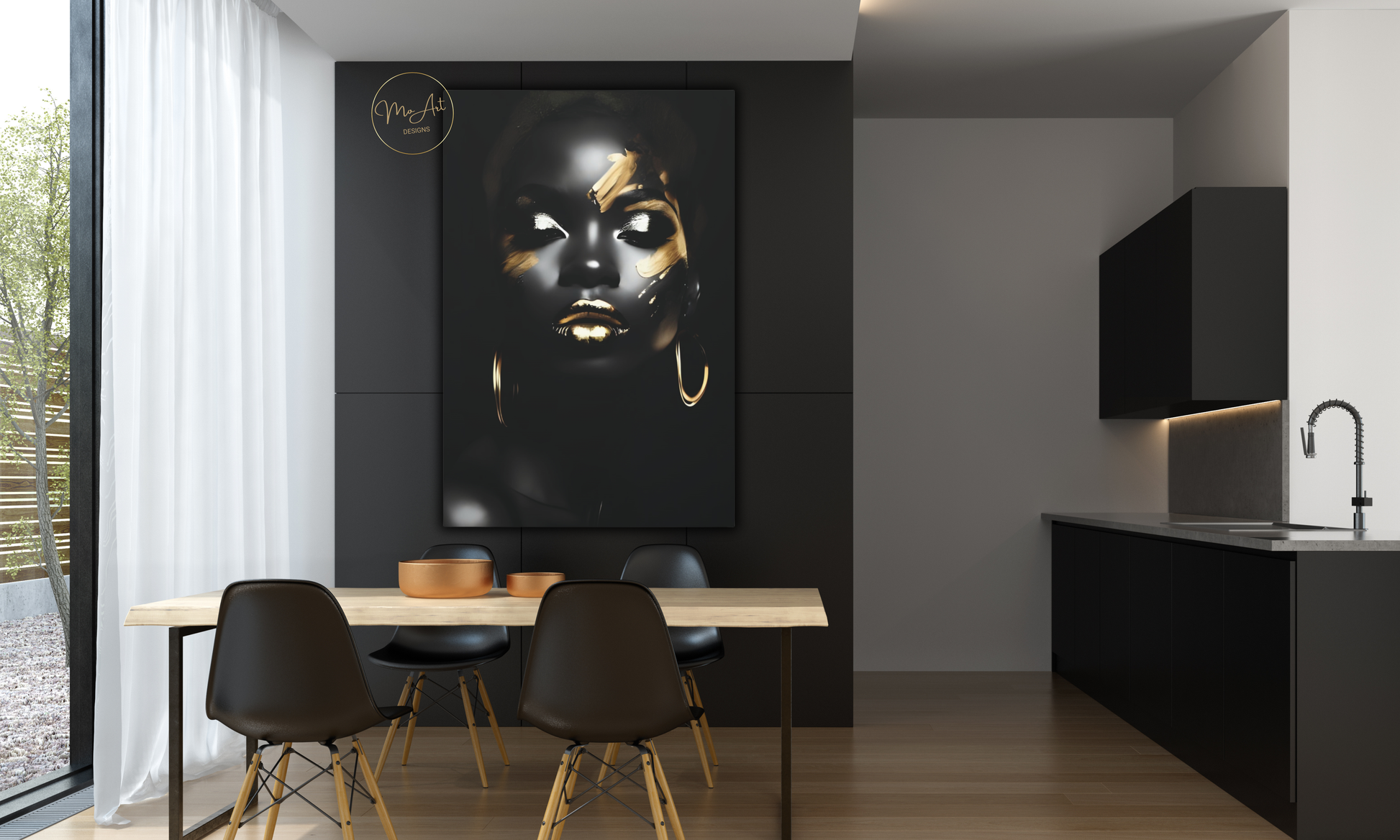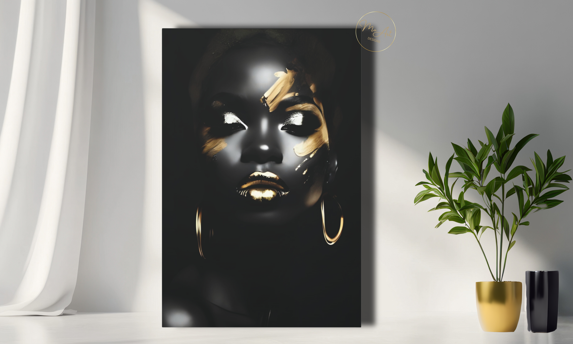 Bring bold sophistication and timeless elegance to your space with this Black & Gold African Woman Canvas Wall Art. This stunning piece captures the essence of power, beauty, and grace through a striking blend of deep black tones and radiant gold accents. The metallic highlights draw the eye, creating a mesmerizing balance between strength and luxury.