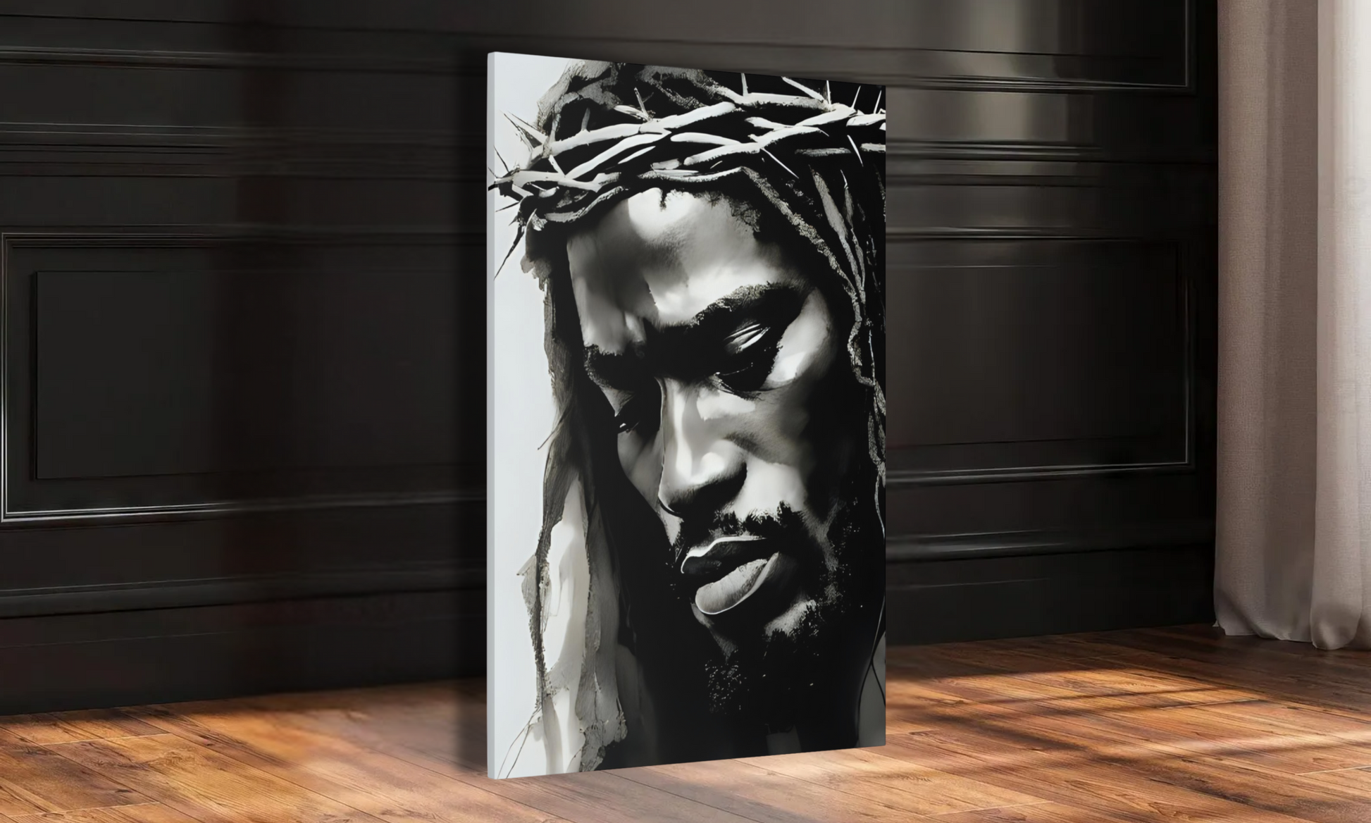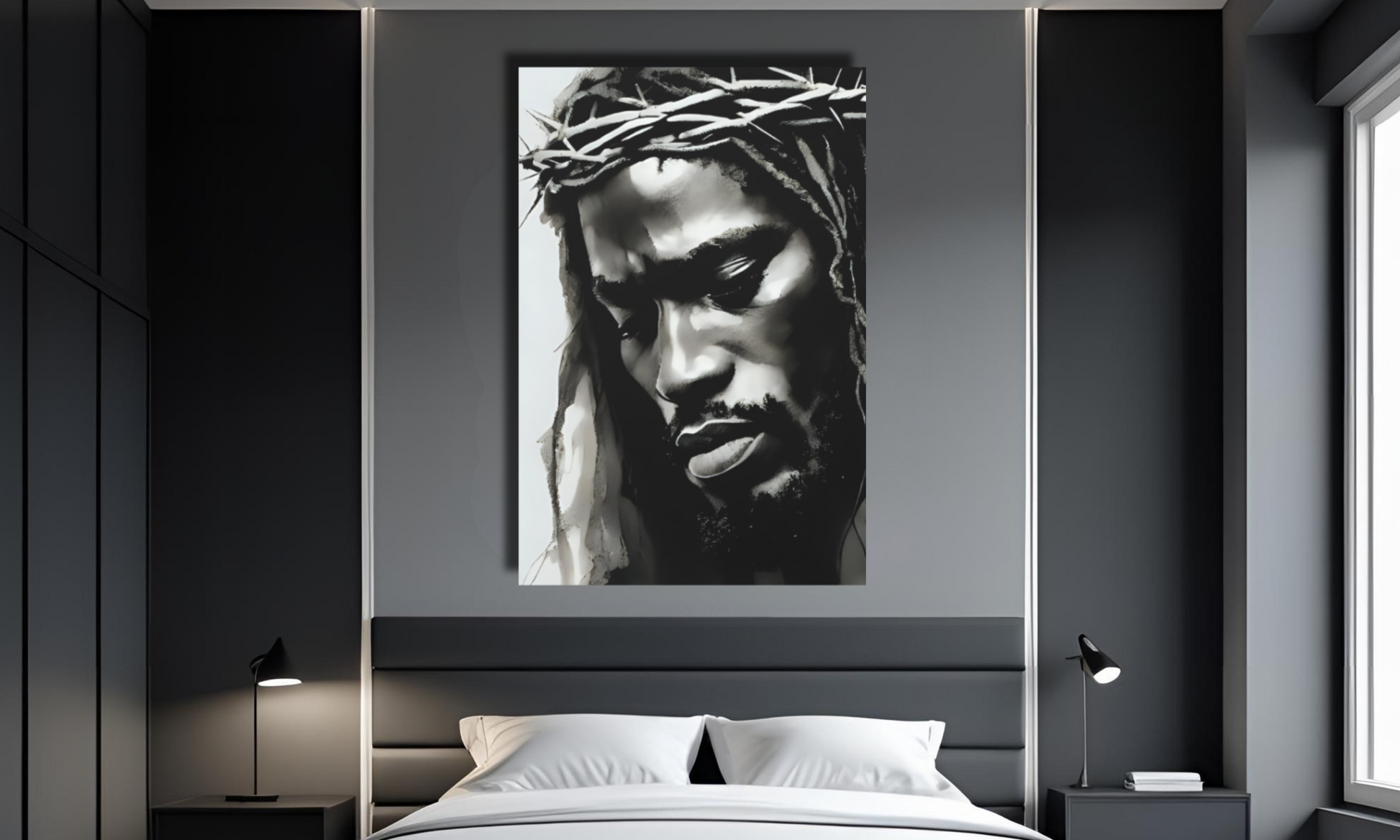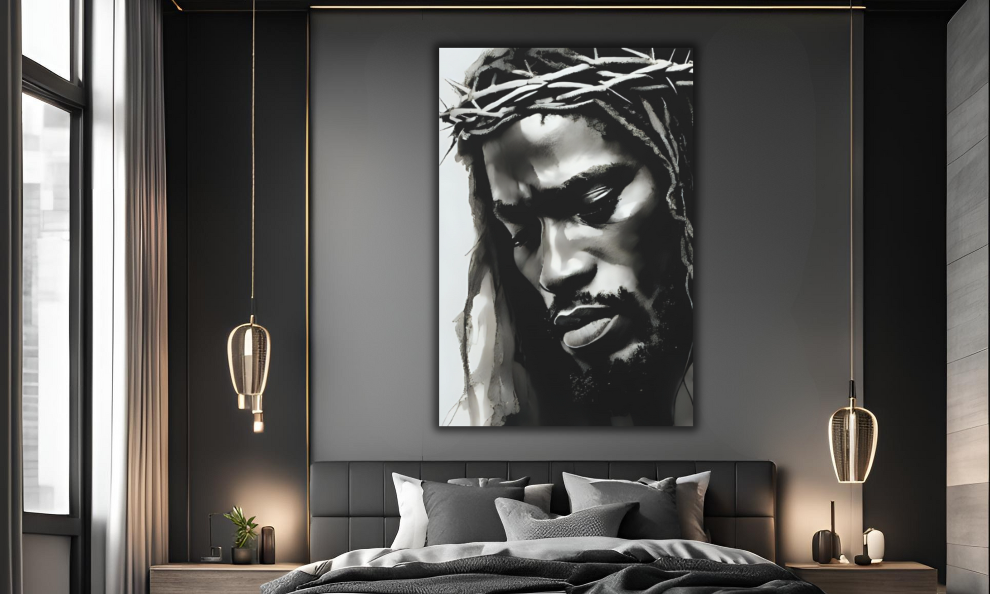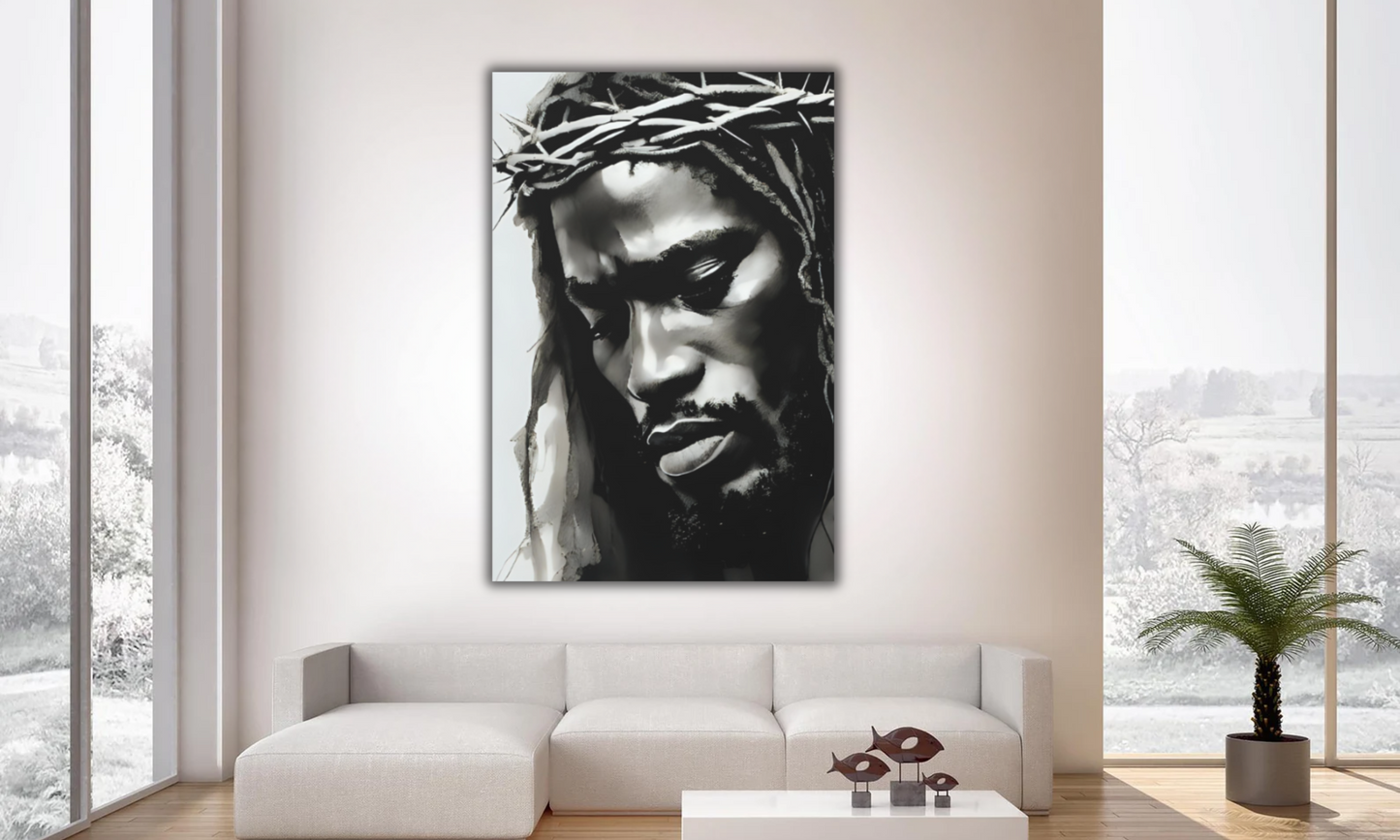 This canvas wall art depicts a powerful and evocative image of Black Jesus wearing a crown of thorns, rendered in a minimalist black-and-white palette that emphasizes emotion and spiritual depth. This artwork combines simplicity with profound symbolism, making it a striking centerpiece for religious or contemplative spaces. Its monochrome design adds a modern, sophisticated touch while highlighting the intensity of the moment, allowing viewers to reflect on themes of sacrifice, resilience, and faith in a subtle yet impactful way.