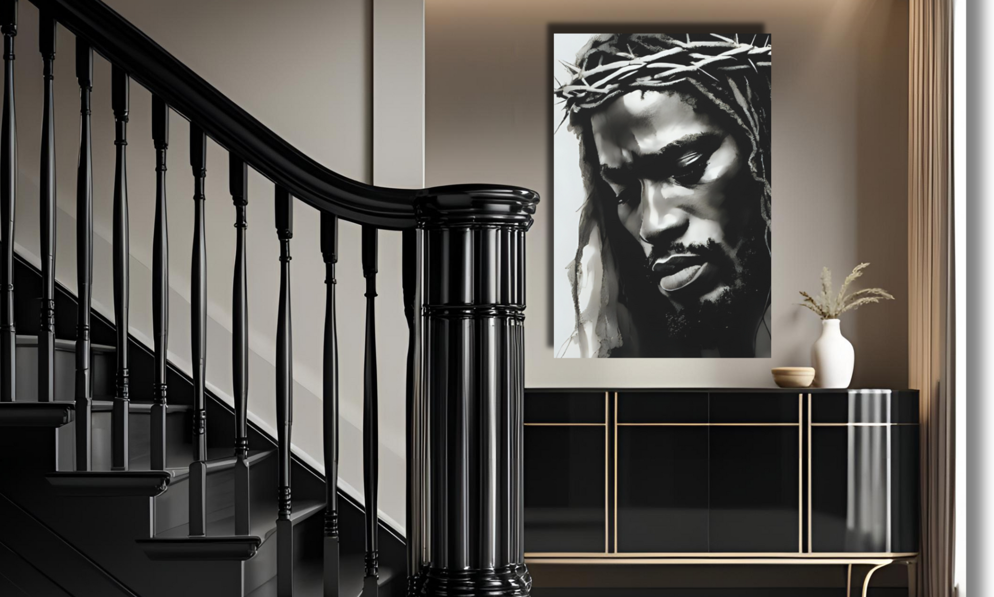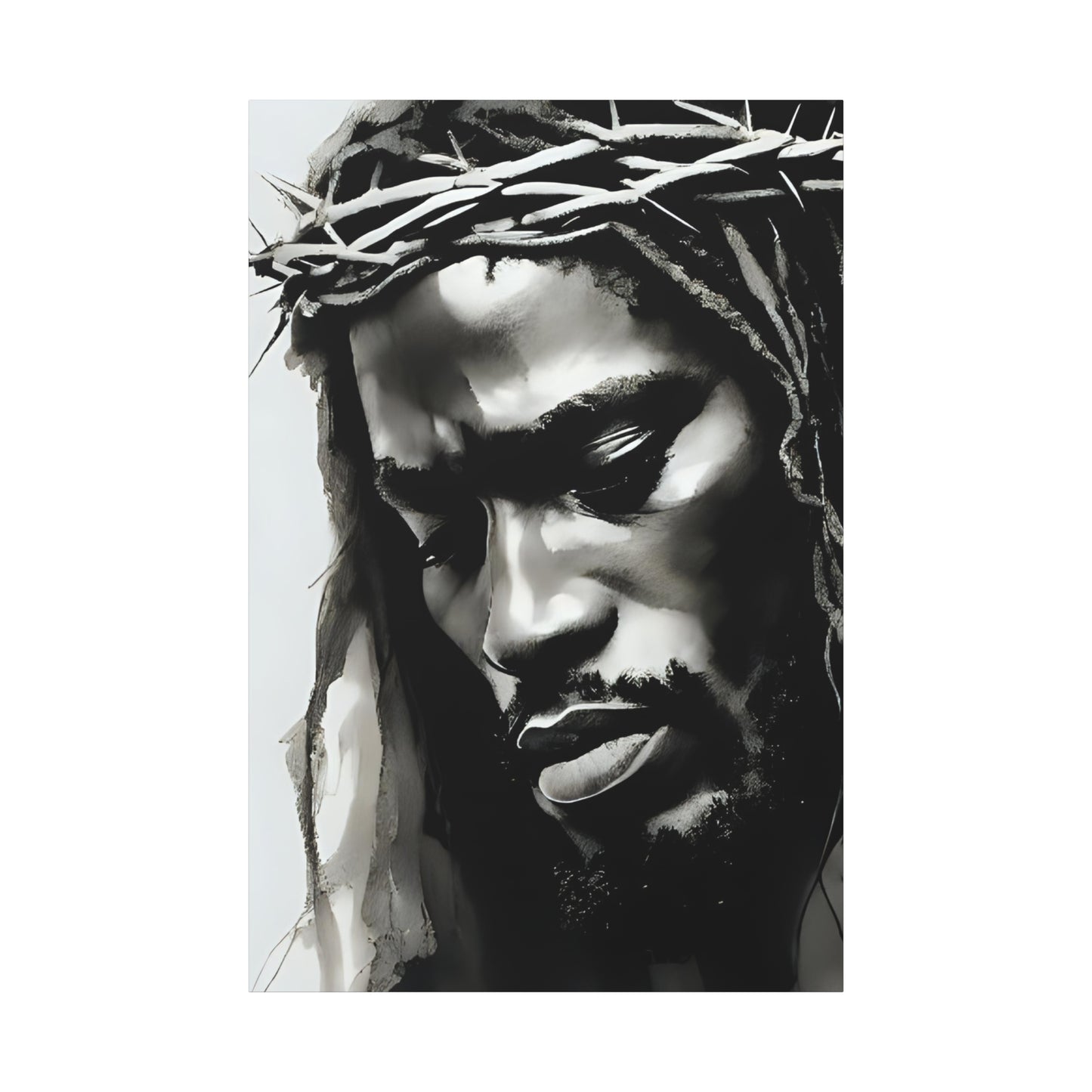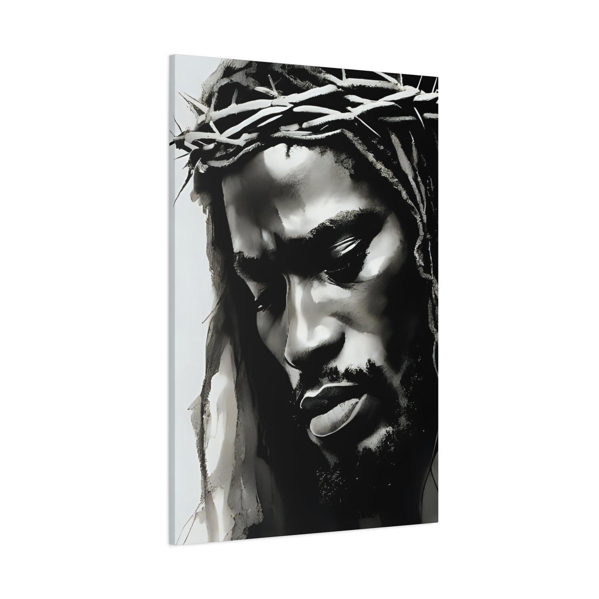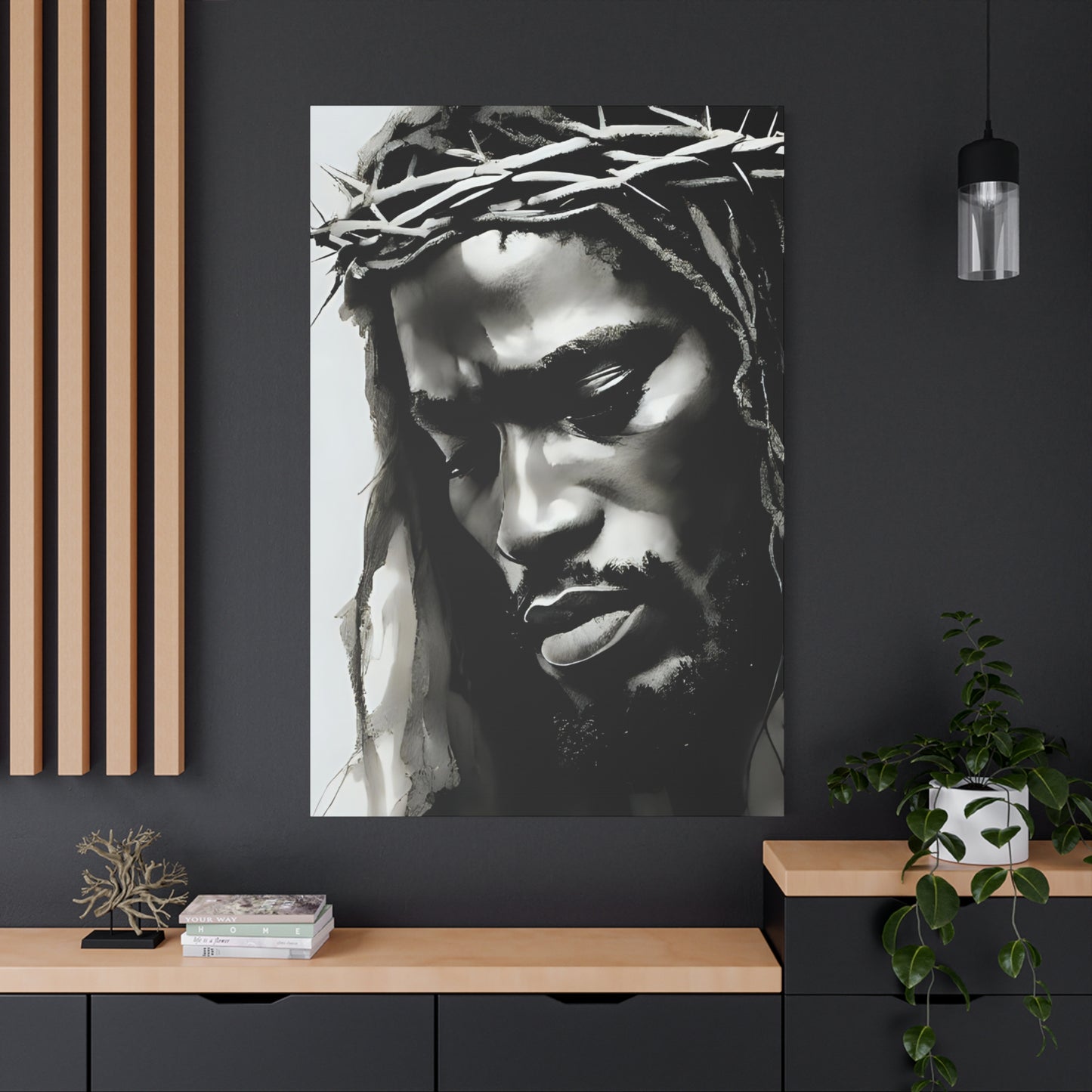 This canvas wall art depicts a powerful and evocative image of Black Jesus wearing a crown of thorns, rendered in a minimalist black-and-white palette that emphasizes emotion and spiritual depth. This artwork combines simplicity with profound symbolism, making it a striking centerpiece for religious or contemplative spaces. Its monochrome design adds a modern, sophisticated touch while highlighting the intensity of the moment, allowing viewers to reflect on themes of sacrifice, resilience, and faith in a subtle yet impactful way.