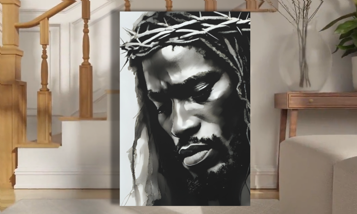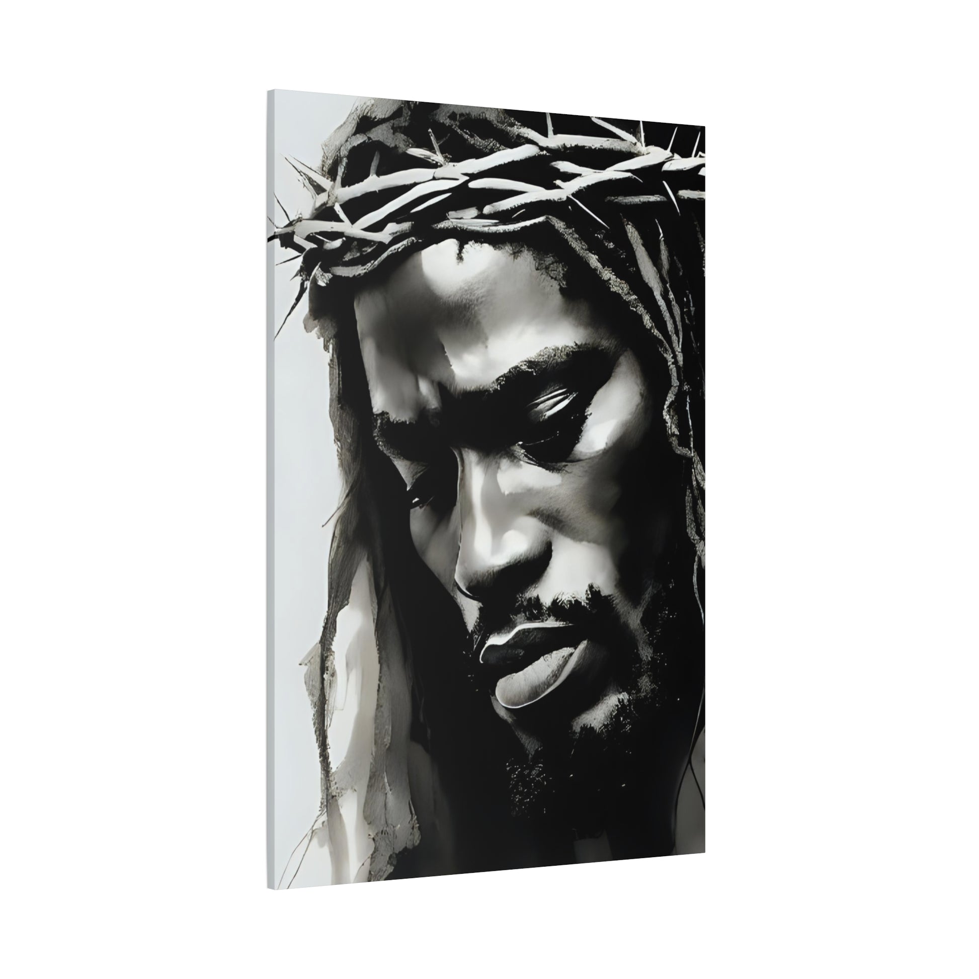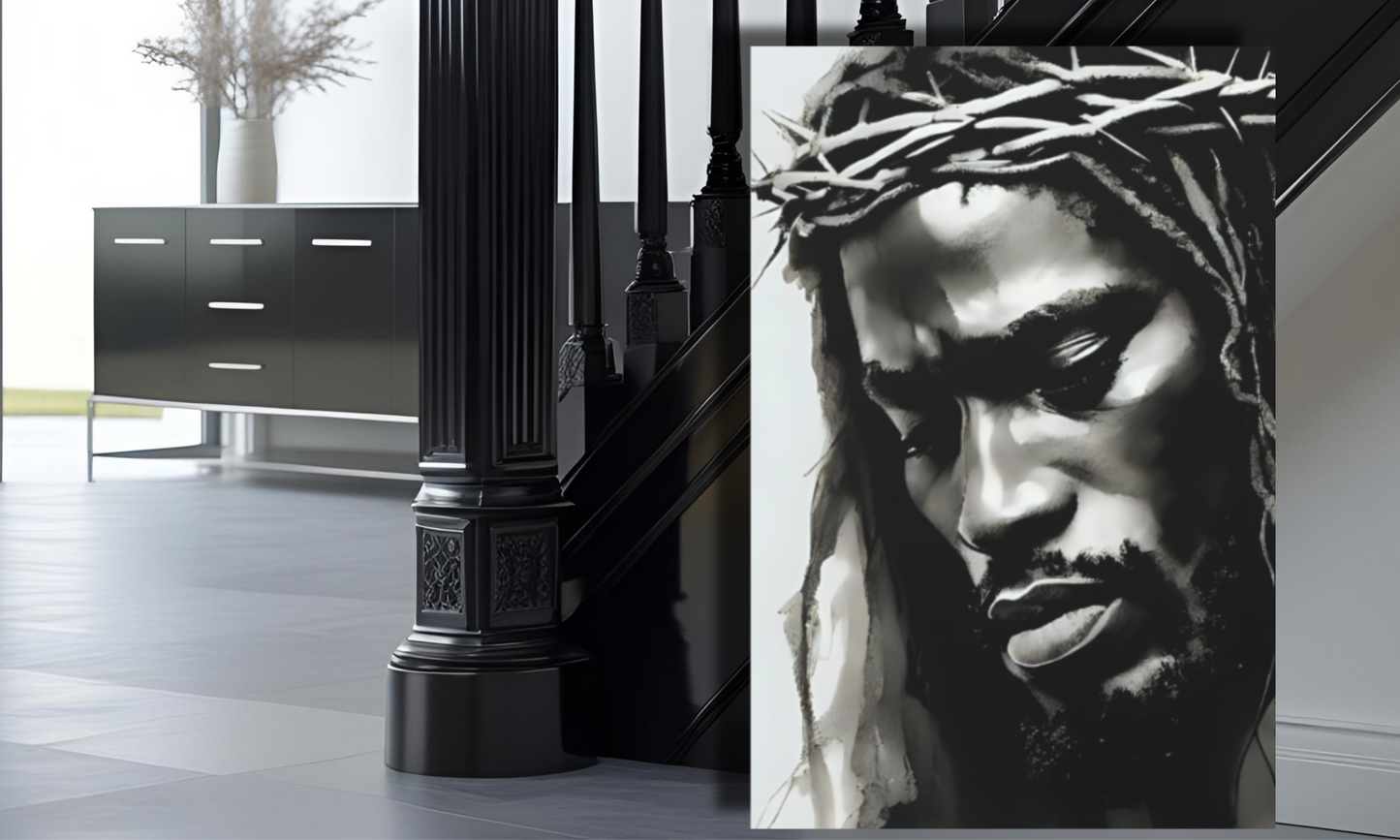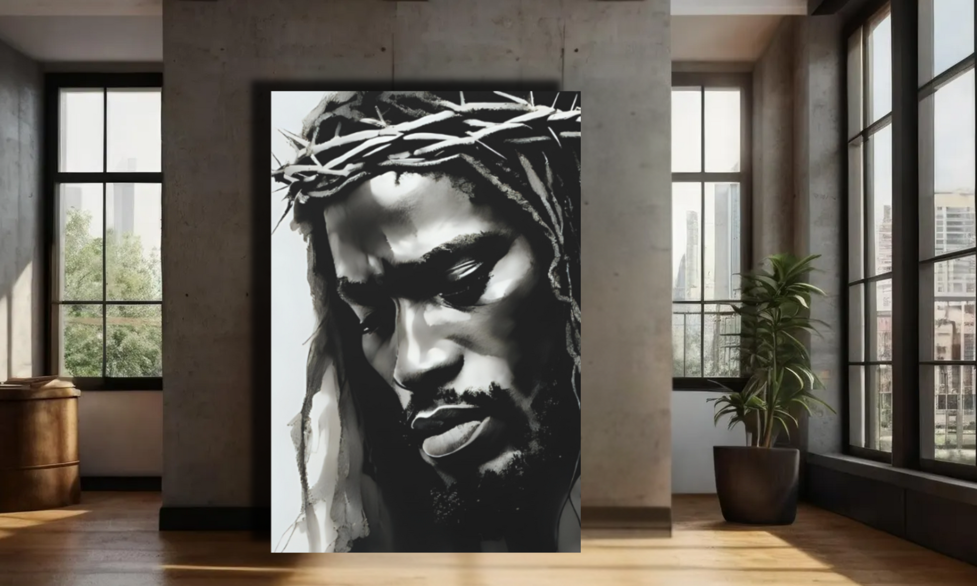 This canvas wall art depicts a powerful and evocative image of Black Jesus wearing a crown of thorns, rendered in a minimalist black-and-white palette that emphasizes emotion and spiritual depth. This artwork combines simplicity with profound symbolism, making it a striking centerpiece for religious or contemplative spaces. Its monochrome design adds a modern, sophisticated touch while highlighting the intensity of the moment, allowing viewers to reflect on themes of sacrifice, resilience, and faith in a subtle yet impactful way.