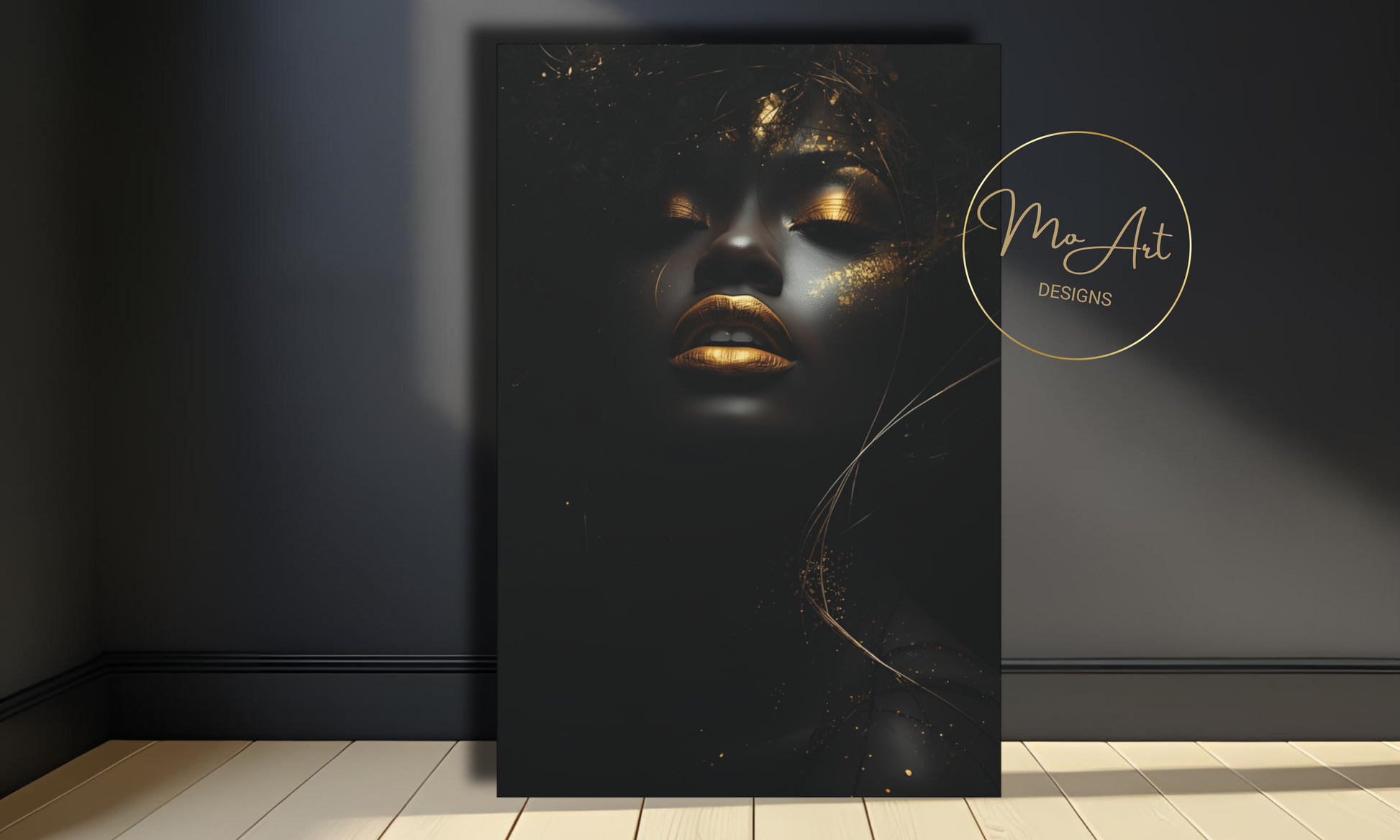 Illuminate your space with the striking beauty and elegance of our Black Woman with Gold Lips Canvas Wall Art. This bold, high-definition artwork features a captivating portrait of a powerful Black woman adorned with radiant gold lips, shimmering gold eyeshadow, and artistic gold accents that seem to dance across her skin and hair. Set against a deep black backdrop, the contrast creates a breathtaking display of strength, femininity, and luxury.