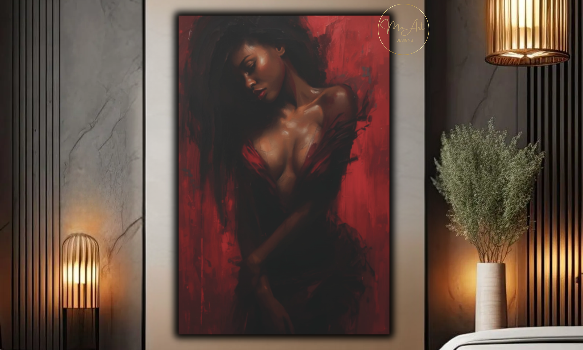 This artwork transforms any room into an atmosphere of romance and passion. Its sultry lighting and luxurious red palette draw the eye instantly, making it a striking centerpiece for bedrooms, personal spaces, or any setting meant to inspire connection and sensuality.