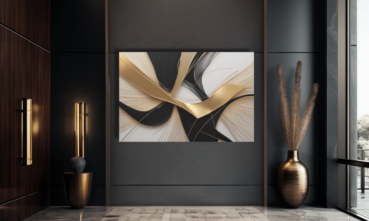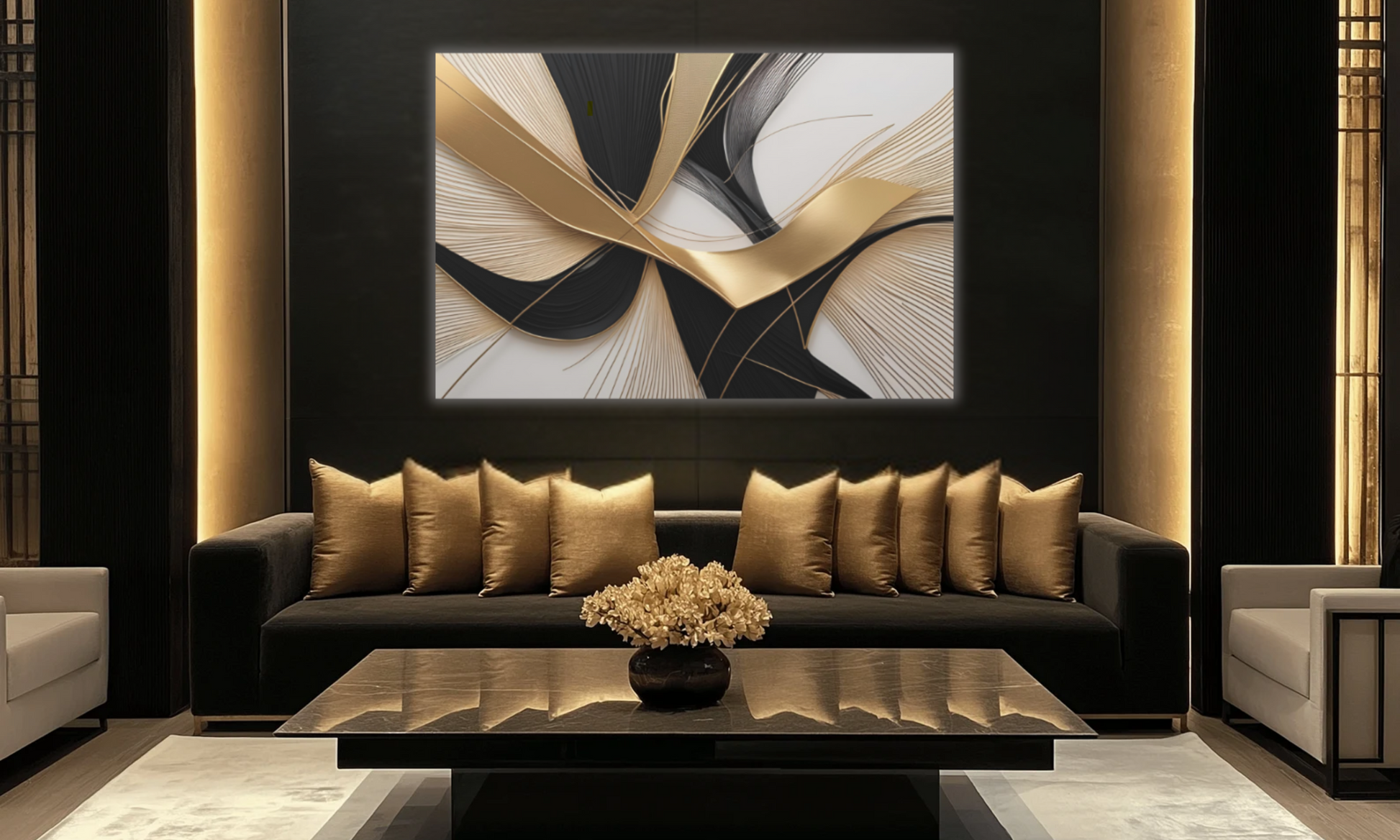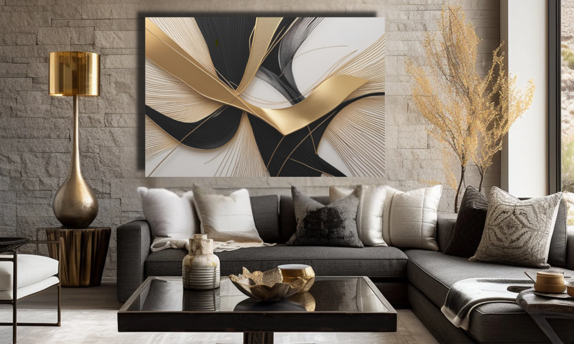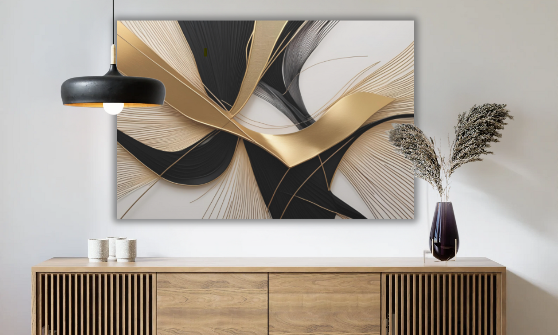 This Elegant Black and Gold Abstract Canvas Wall Art exudes sophistication with its sleek black brushstrokes paired with shimmering gold accents, creating a luxurious and timeless piece that elevates the aesthetic of any modern interior, perfect for adding a touch of class and contemporary style to your decor.