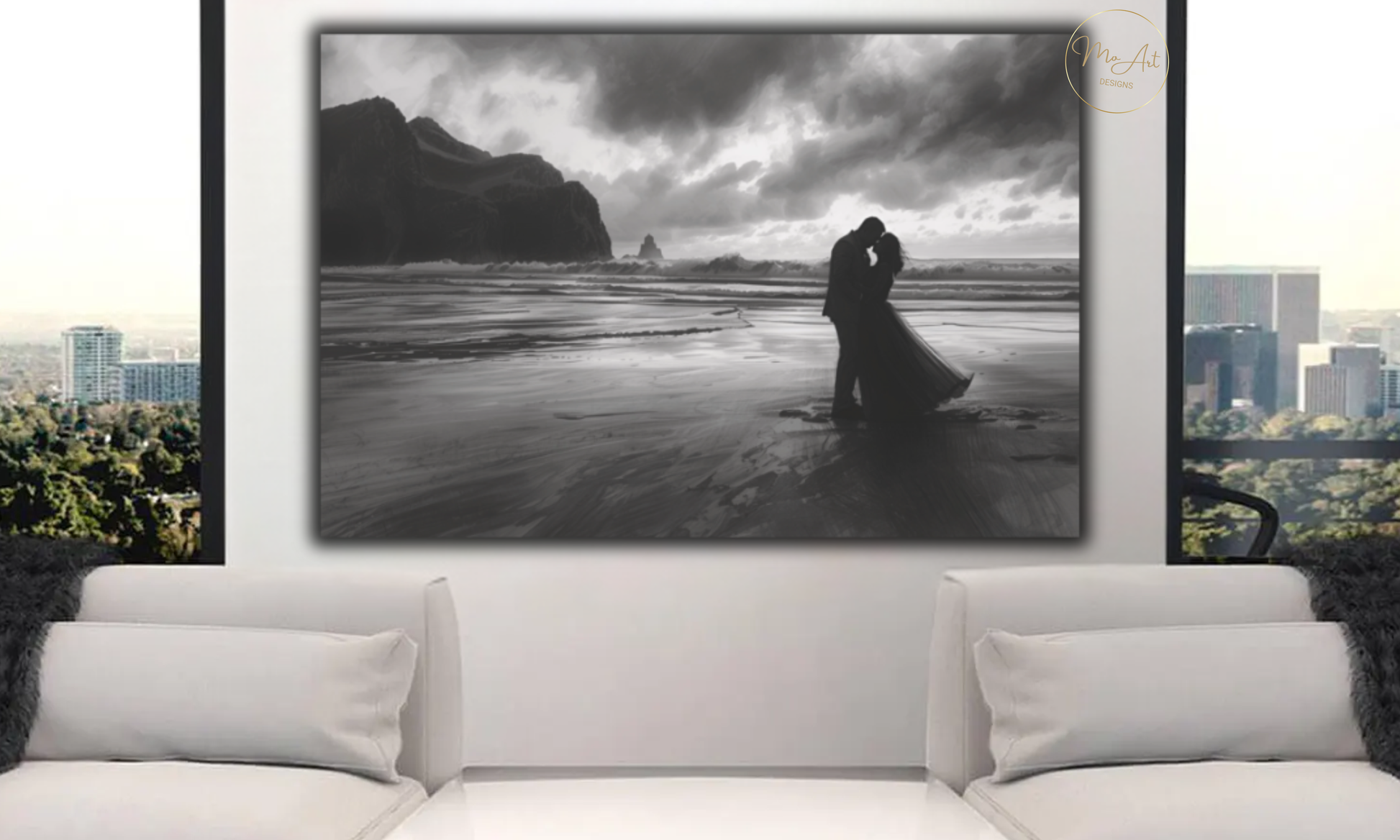 Bring timeless romance into your space with this breathtaking black-and-white canvas art. “Eternal Tide of Love” captures a couple sharing an intimate embrace on a quiet shoreline, framed by dramatic skies, rolling waves, and the soft glow of fading daylight. The atmosphere is both powerful and tender, blending raw natural beauty with deep emotional connection.