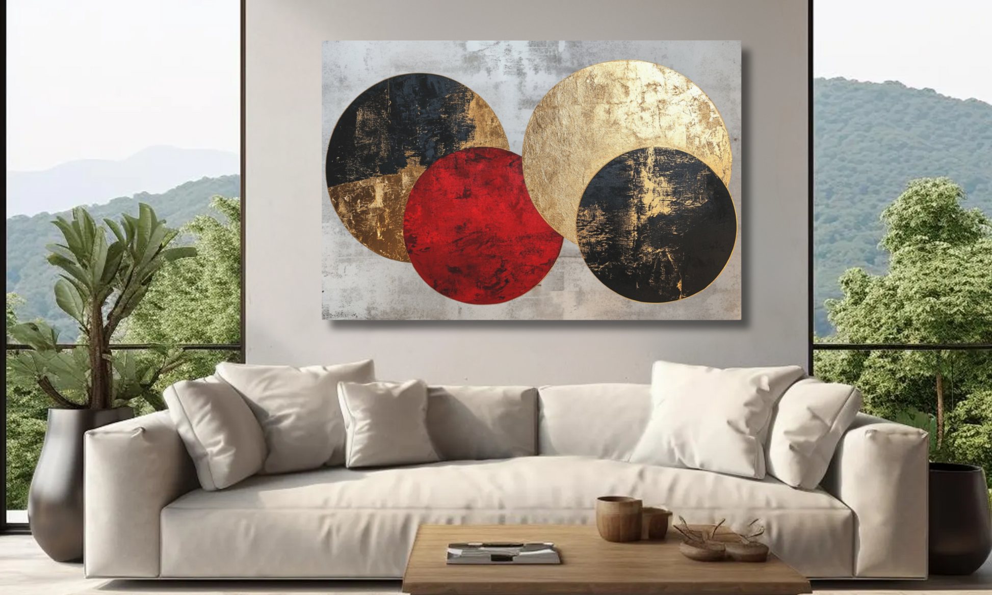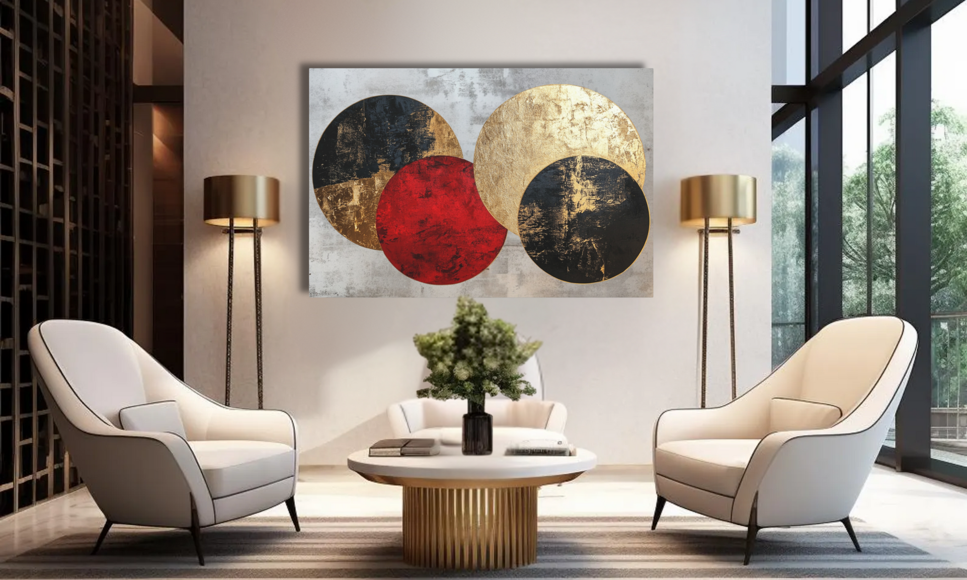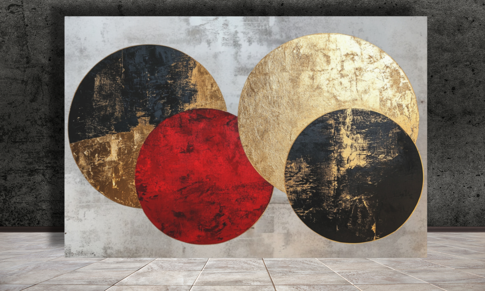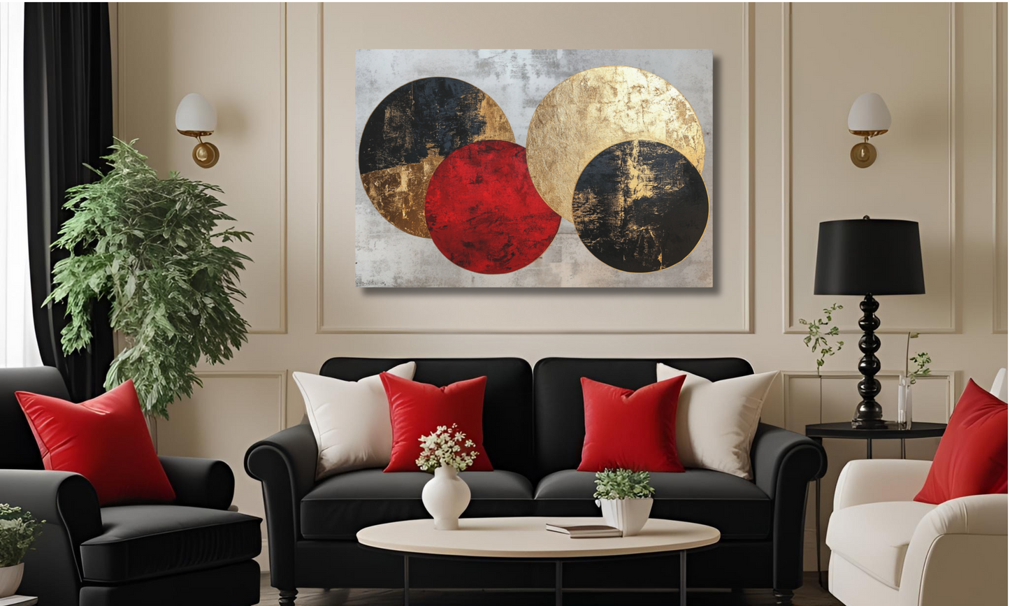 This Gold, Black, and Red Circle Abstract Canvas Wall Art features a striking design with bold circular motifs that blend luxurious gold, dramatic black, and vibrant red hues. Its contemporary aesthetic creates a powerful visual impact, making it an ideal focal point for modern living spaces, offices, or galleries. The artwork’s dynamic color contrast and geometric simplicity add sophistication and energy, elevating any room’s decor with a touch of artistic elegance and modern flair.