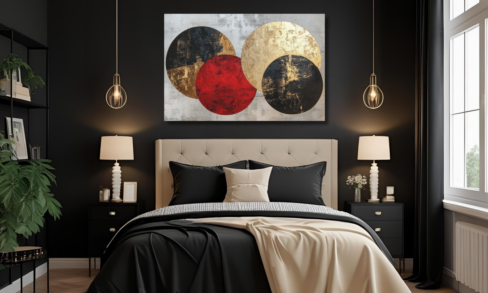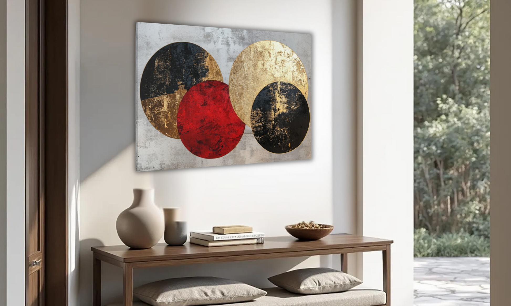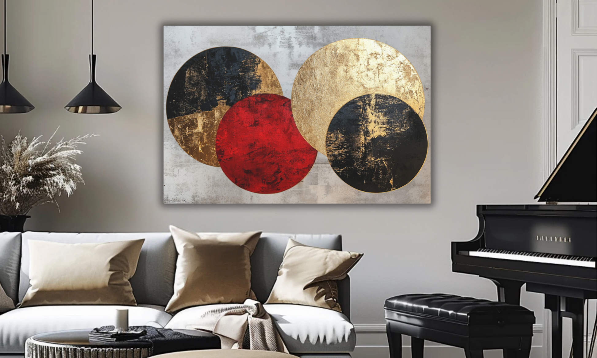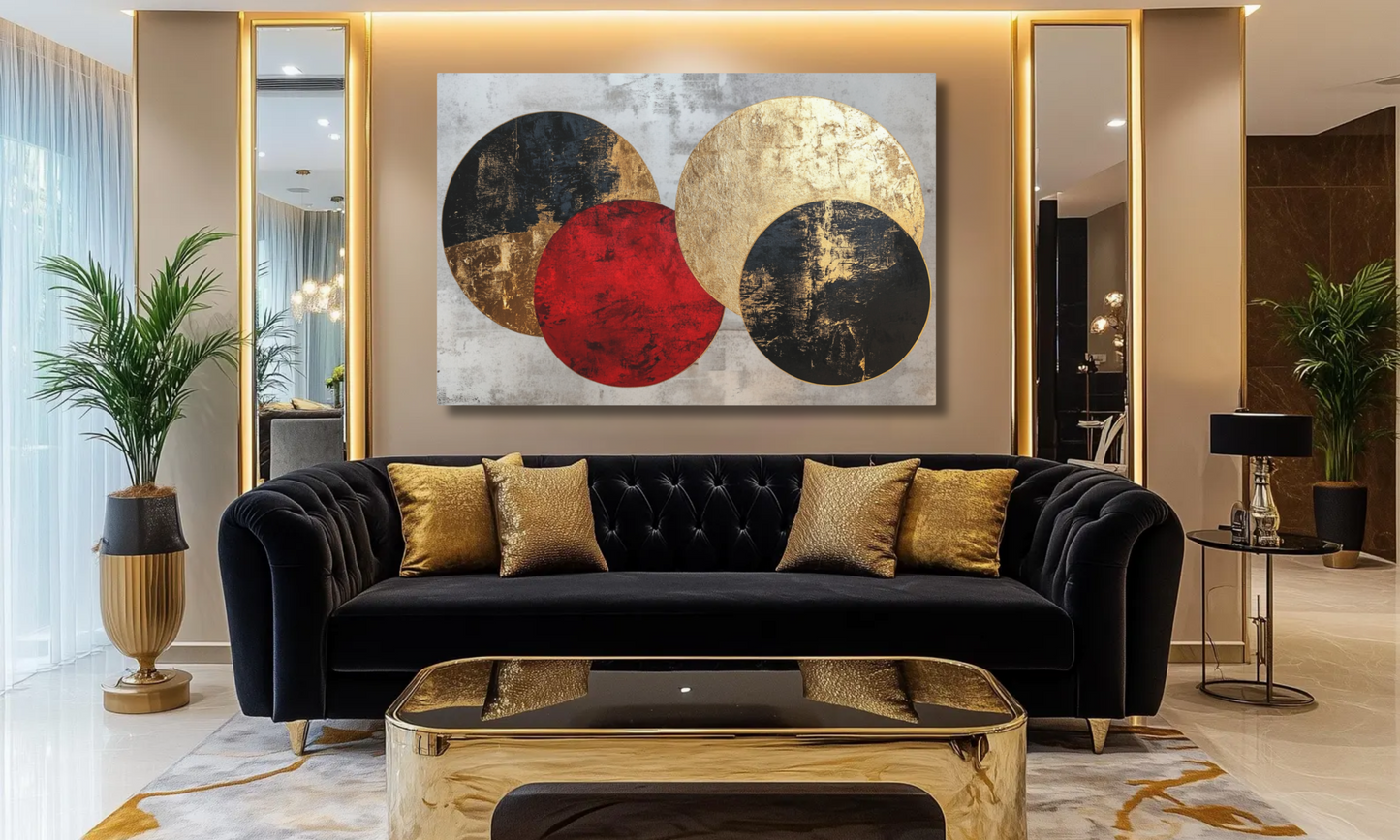 This Gold, Black, and Red Circle Abstract Canvas Wall Art features a striking design with bold circular motifs that blend luxurious gold, dramatic black, and vibrant red hues. Its contemporary aesthetic creates a powerful visual impact, making it an ideal focal point for modern living spaces, offices, or galleries. The artwork’s dynamic color contrast and geometric simplicity add sophistication and energy, elevating any room’s decor with a touch of artistic elegance and modern flair.