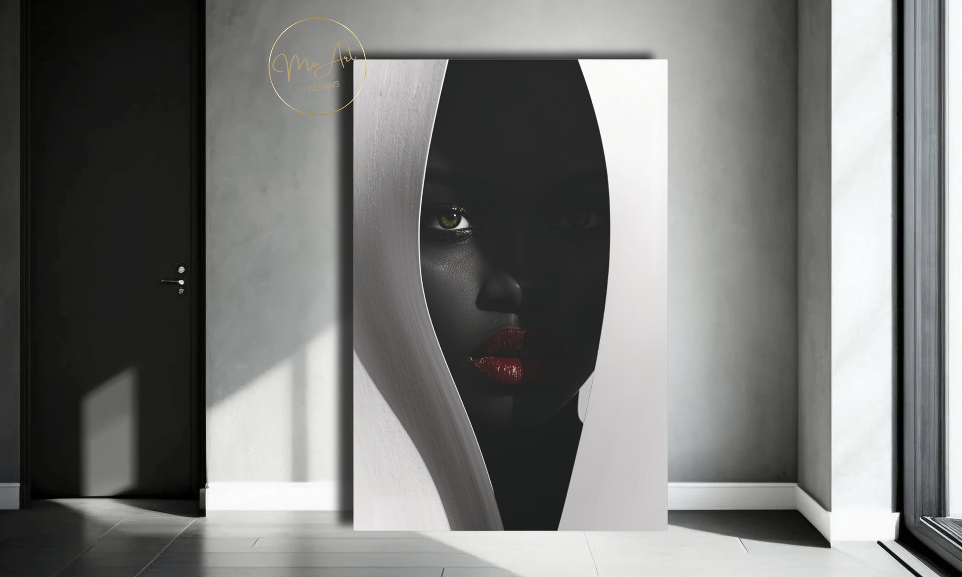 Unveil the mystery within “Hidden Desire”, a captivating abstract canvas wall art that celebrates allure, strength, and sophistication. The striking contrast of deep black tones against smooth white curves draws the eye toward a mesmerizing face — highlighted by piercing green eyes and bold red lips that radiate confidence and intrigue.