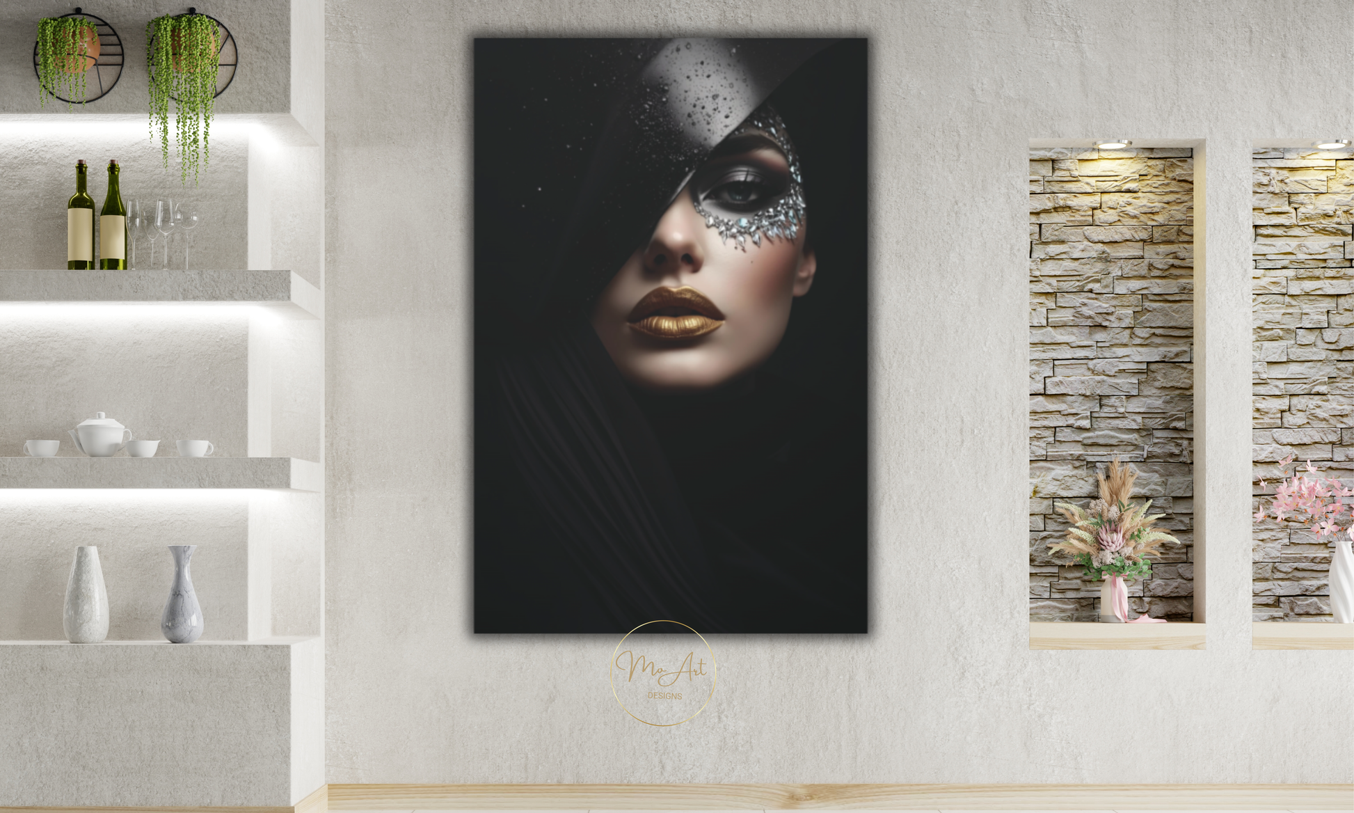 Step into a world of allure and sophistication with Midnight Elegance. This striking artwork captures the mysterious beauty of a woman draped in deep shadows, her golden lips and jeweled mask shimmering with refined grace. The contrast of darkness and metallic tones creates a mesmerizing visual statement — perfect for modern, luxury, or fashion-inspired interiors.