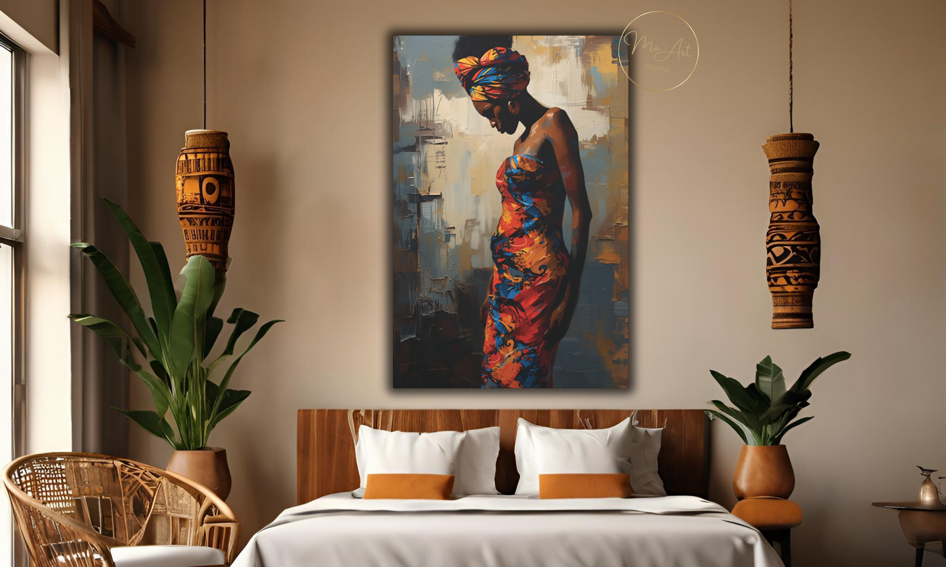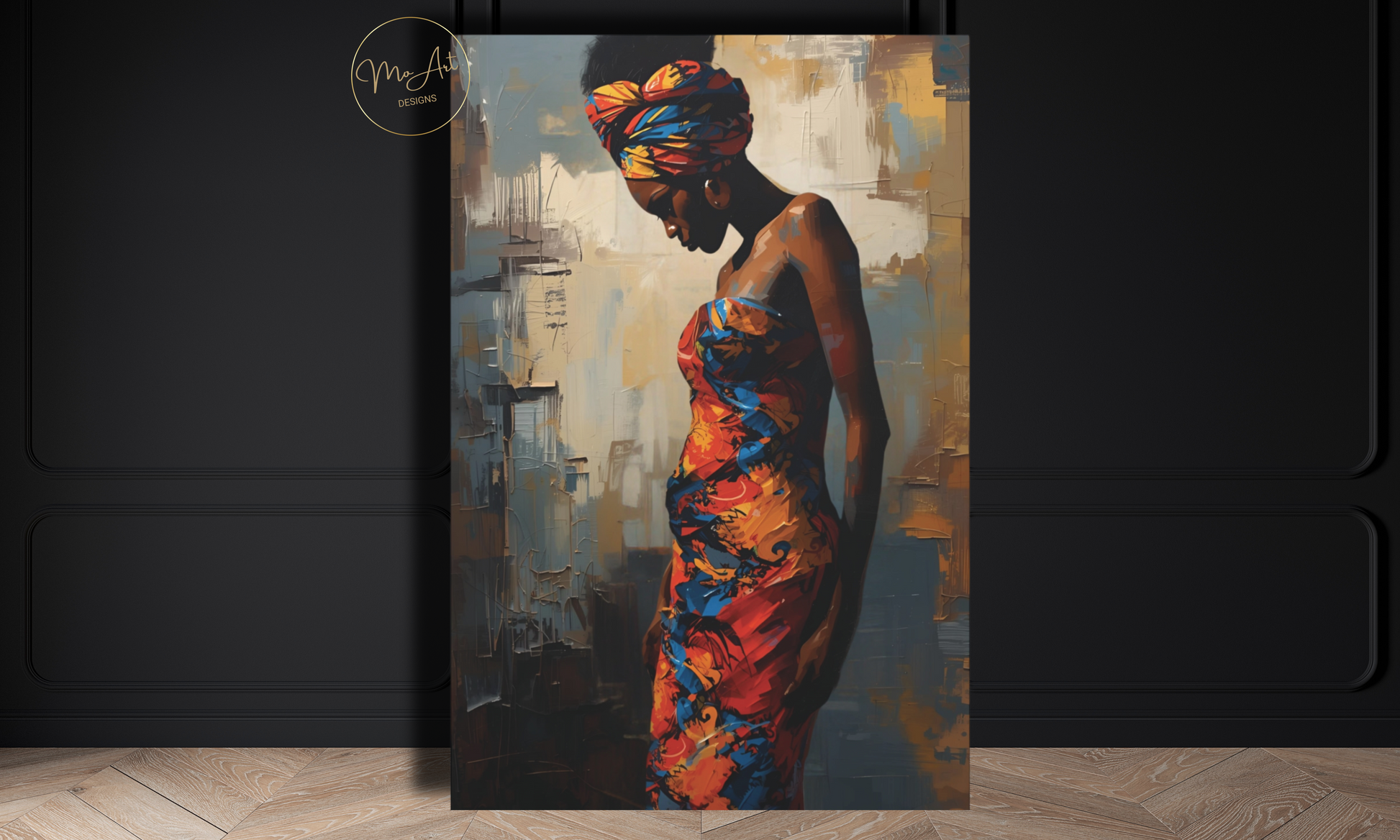 Celebrate the strength, grace, and beauty of womanhood with “Radiance of Motherhood.” This stunning abstract canvas wall art portrays an African woman adorned in a vibrant dress and headwrap, captured in a moment of serene reflection. The bold blend of fiery oranges, deep blues, and golden hues brings warmth, culture, and elegance to any space. Perfect for living rooms, bedrooms, or gallery walls, this piece is more than art—it’s a tribute to heritage, pride, and resilience.