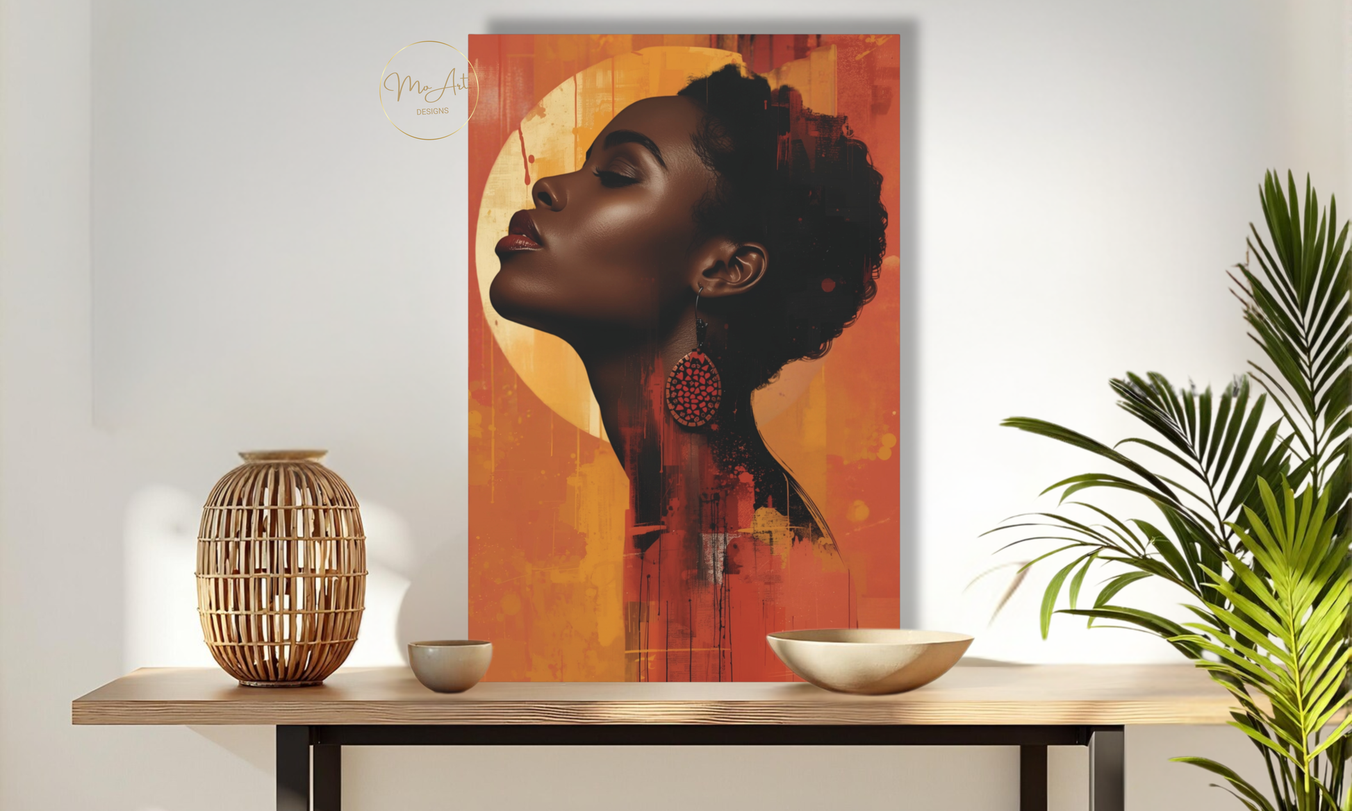 Ignite your space with the warm, Afrocentric energy of Radiant Rise – Abstract Canvas Wall Art. This striking piece features the poised profile of a beautiful Black woman illuminated by sun-drenched hues of orange, gold, and deep ember tones. Her confident silhouette blends seamlessly with expressive paint splashes, symbolizing strength, heritage, and creative fire.