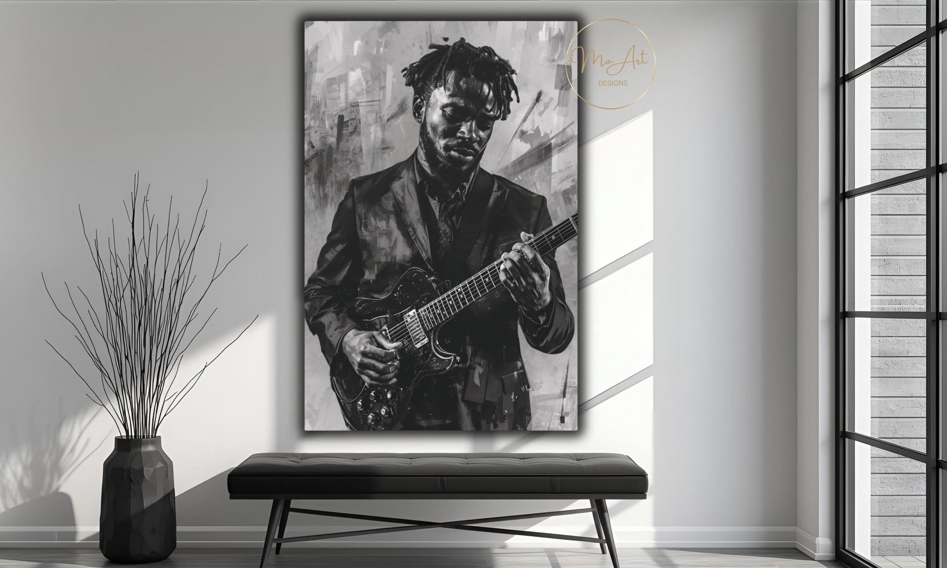 Bring the power of music and emotion into your space with Soulful Strings – Black Guitarist Canvas Art. This striking black and white piece captures the raw passion of a musician lost in his craft, blending bold detail with artistic abstraction. Perfect for music lovers, jazz enthusiasts, and modern art collectors, it makes a statement of rhythm, style, and soul.